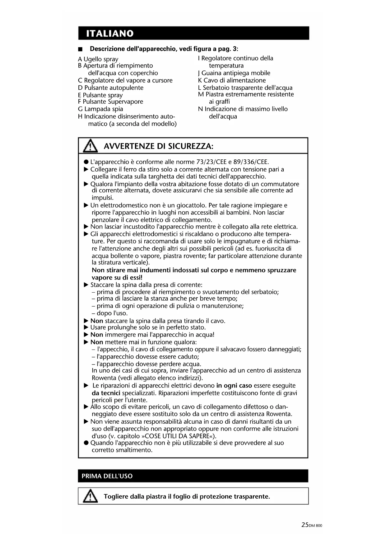 l'appecchio, il cavo di collegamento oppure il salvacavo fossero danneggiati; – l'apparecchio dovesse essere caduto; – l'apparecchio dovesse perdere acqua. In uno dei casi di cui sopra, inviare l'apparecchio ad un centro di assistenza Rowenta (vedi allegato elenco indirizzi). E Le riparazioni di apparecchi elettrici devono in ogni caso essere eseguite da tecnici specializzati. Riparazioni imperfette costituiscono fonte di gravi pericoli per l'utente. E Allo scopo di evitare pericoli, un cavo di collegamento difettoso o dan- neggiato deve essere sostituito solo da un centro di assistenza Rowenta. E Non viene assunta responsabilità alcuna in caso di danni risultanti da un suo dell'apparecchio non appropriato oppure non conforme alle istruzioni d'uso (v. capitolo »COSE UTILI DA SAPERE«). P Quando l'apparecchio non è più utilizzabile si deve provvedere al suo corretto smaltimento. PRIMA DELL'USO Togliere dalla piastra il foglio di protezione trasparente. AVVERTENZE DI SICUREZZA: