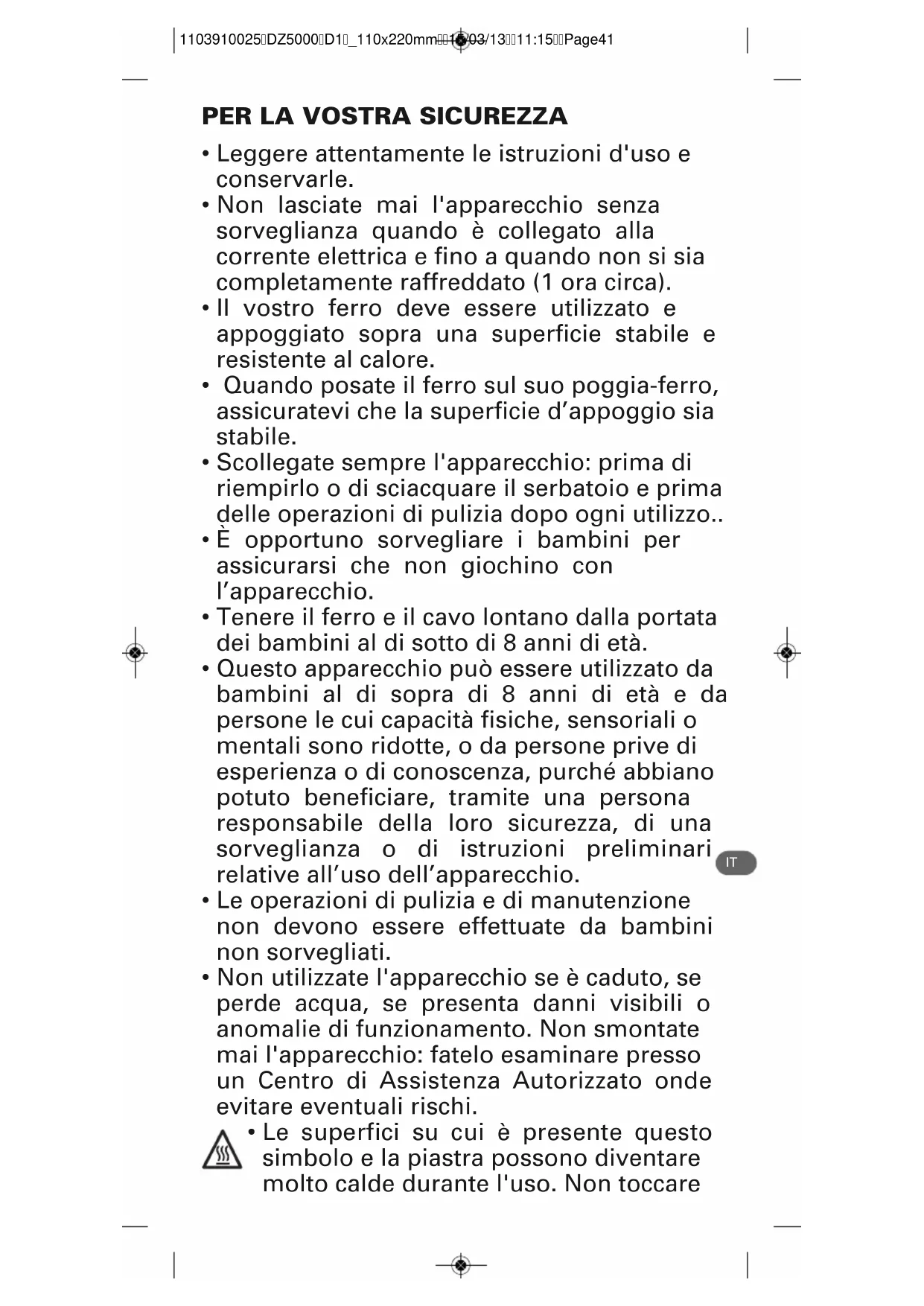 - Le superfici su cui è presente questo simbolo e la piastra possono diventare molto calde durante l'uso. Non toccare 1103910025DZ5000D1_110x220mm15/03/1311:15Page4142 tali parti fino a che il ferro non si è raffreddato. RACCOMANDAZIONI IMPORTANTI