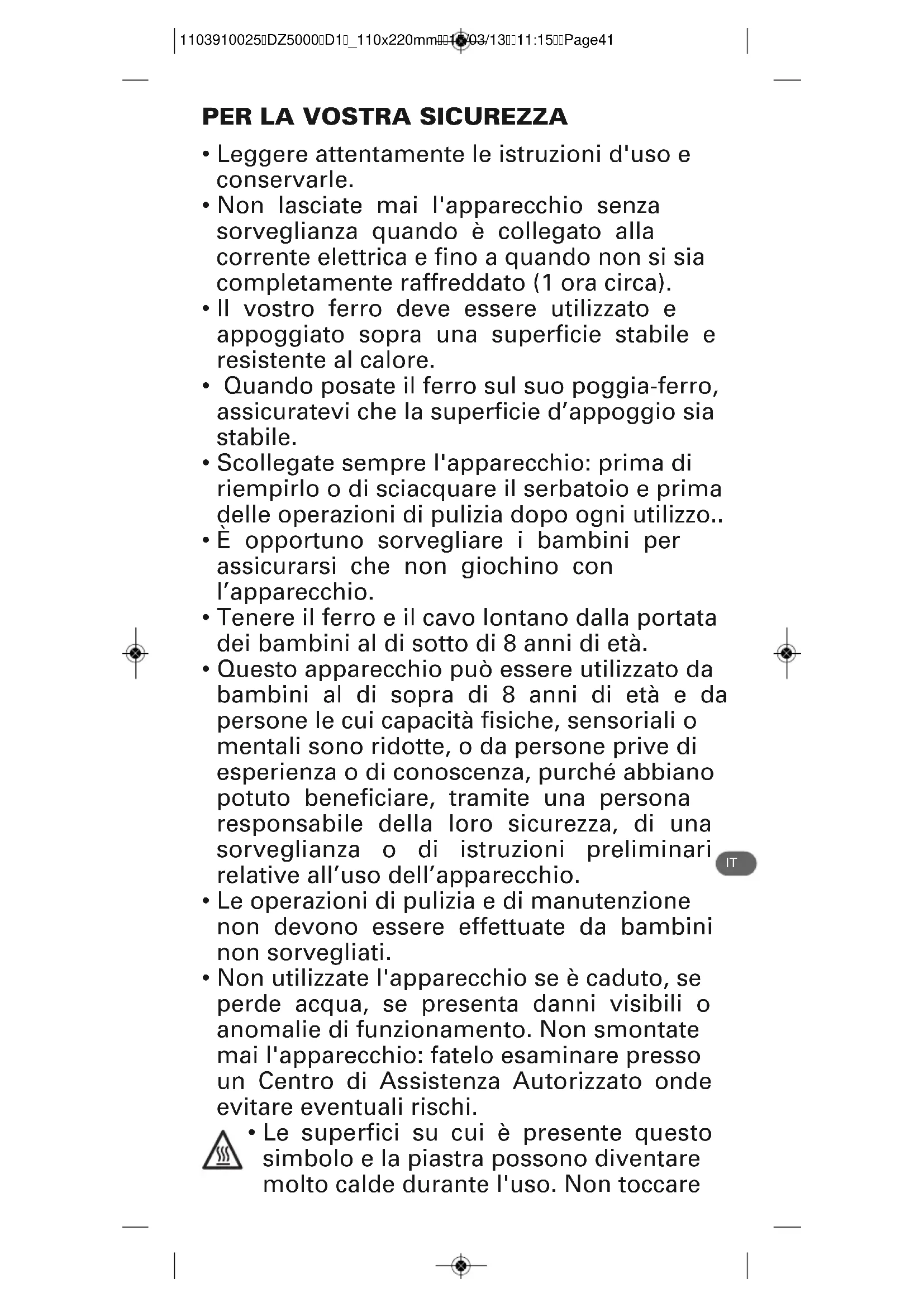 - Le superfici su cui è presente questo simbolo e la piastra possono diventare molto calde durante l'uso. Non toccare 1103910025DZ5000D1_110x220mm15/03/1311:15Page4142 tali parti fino a che il ferro non si è raffreddato. RACCOMANDAZIONI IMPORTANTI