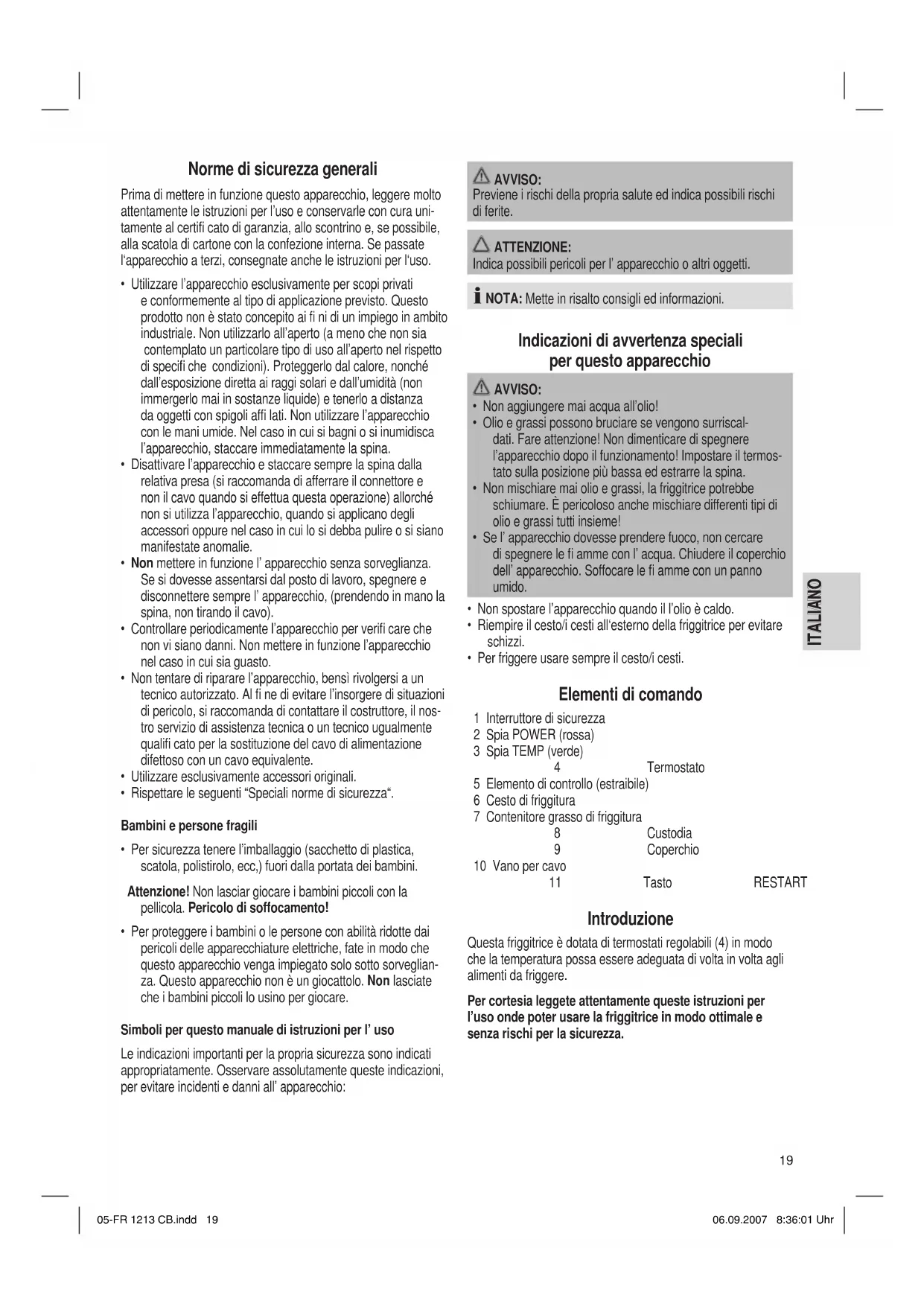 - Per friggere usare sempre il cesto/i cesti. Elementi di comando 1 Interruttore di sicurezza 2 Spia POWER (rossa) 3 Spia TEMP (verde) 4 Termostato 5 Elemento di controllo (estraibile) 6 Cesto di friggitura 7 Contenitore grasso di friggitura 8 Custodia 9 Coperchio 10 Vano per cavo 11 Tasto RESTART Introduzione Questa friggitrice è dotata di termostati regolabili (4) in modo che la temperatura possa essere adeguata di volta in volta agli alimenti da friggere. Per cortesia leggete attentamente queste istruzioni per l’uso onde poter usare la friggitrice in modo ottimale e senza rischi per la sicurezza. 05-FR 1213 CB.indd 1905-FR 1213 CB.indd 19 06.09.2007 8:36:01 Uhr06.09.2007 8:36:01 Uhr20 ITALIANO ITALIANO Collegamento elettrico Potenza allacciata La friggitrice doppia può assorbire una potenza massima totale di 4000 W. Con questa potenza allacciata si consigliano due linee di alimentazione separate con una sicura mediante un interruttore di protezione a fi ni domestici da 16 A. L’apparecchio può essere collegato solo ad una presa con contatto di terra regolarmente installata da 230 V, 50 Hz. Ogni lato della friggitrice può essere azionato anche separata- mente perché l‘apparecchio dispone di due linee di alimenta- zione. ATTENZIONE: SOVRACCARICO A causa della potenza di questo apparecchio, non fare uso di cavi di prolungamento oppure di prese multiple. Messa in esercizio Prima della prima messa in esercizio