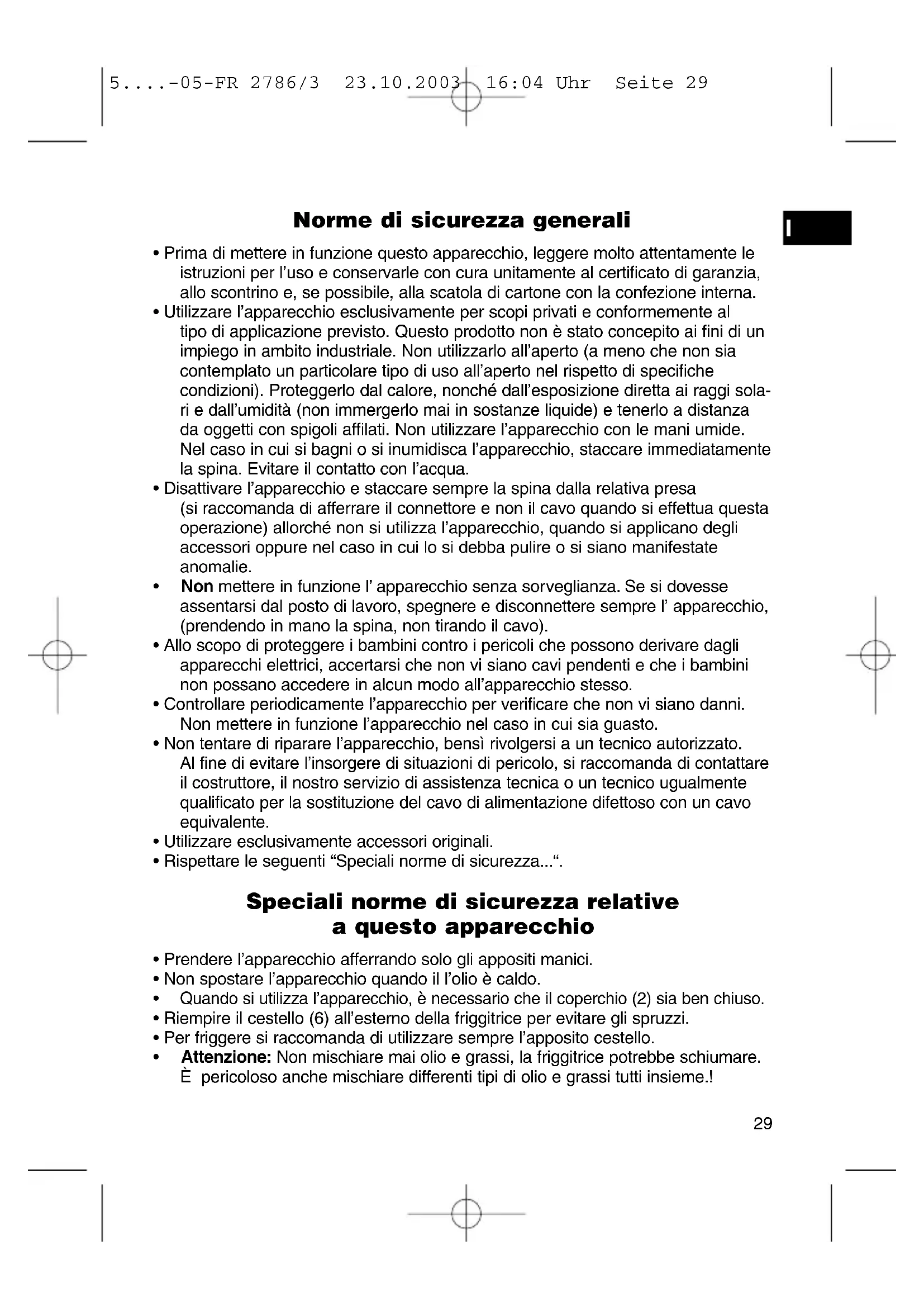 - Rispettare le seguenti “Speciali norme di sicurezza...“. Speciali norme di sicurezza relative a questo apparecchio