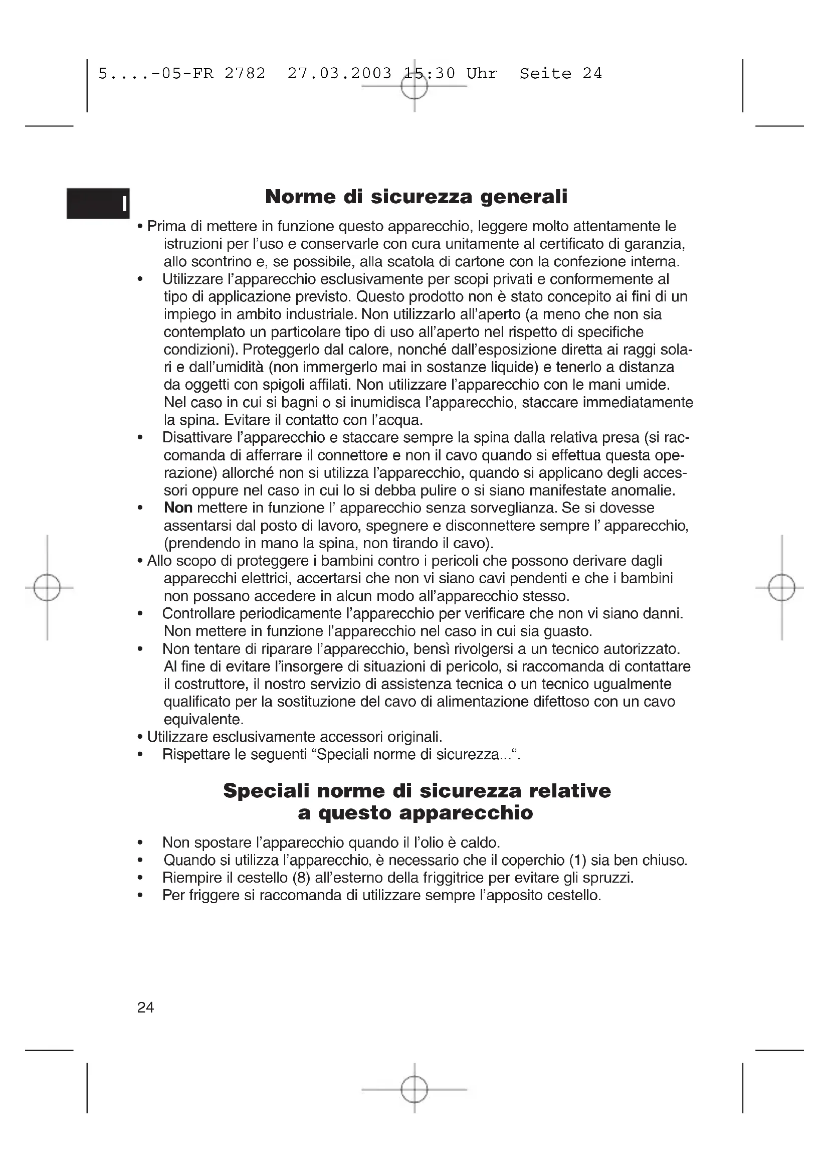 5....-05-FR 2782 27.03.2003 15:30 Uhr Seite 24Introduzione Questa friggitrice è dotata di un termostato regolabile al fine di poter adeguare la temperatura ai singoli cibi da friggere. Per cortesia leggete attentamente queste istruzioni per l’uso onde poter usare la friggitrice in modo ottimale e senza rischi per la sicurezza. Collegamento L’apparecchio può essere collegato solo ad una presa con contatto di terra regolarmente installata da 230 V, 50 Hz. Elenco degli elementi di comando Messa in esercizio Prima della prima messa in esercizio 1 Togliere l’imballaggio. Aprire la friggitrice premendo il tasto (3). Nella friggitrice è contenuto il cesto per la friggitura. 2 Si consiglia di pulire bene il coperchio, la scatola, il contenitore e il cesto per la friggitura come descritto in PULIZIA. Avvertenze per l’utente