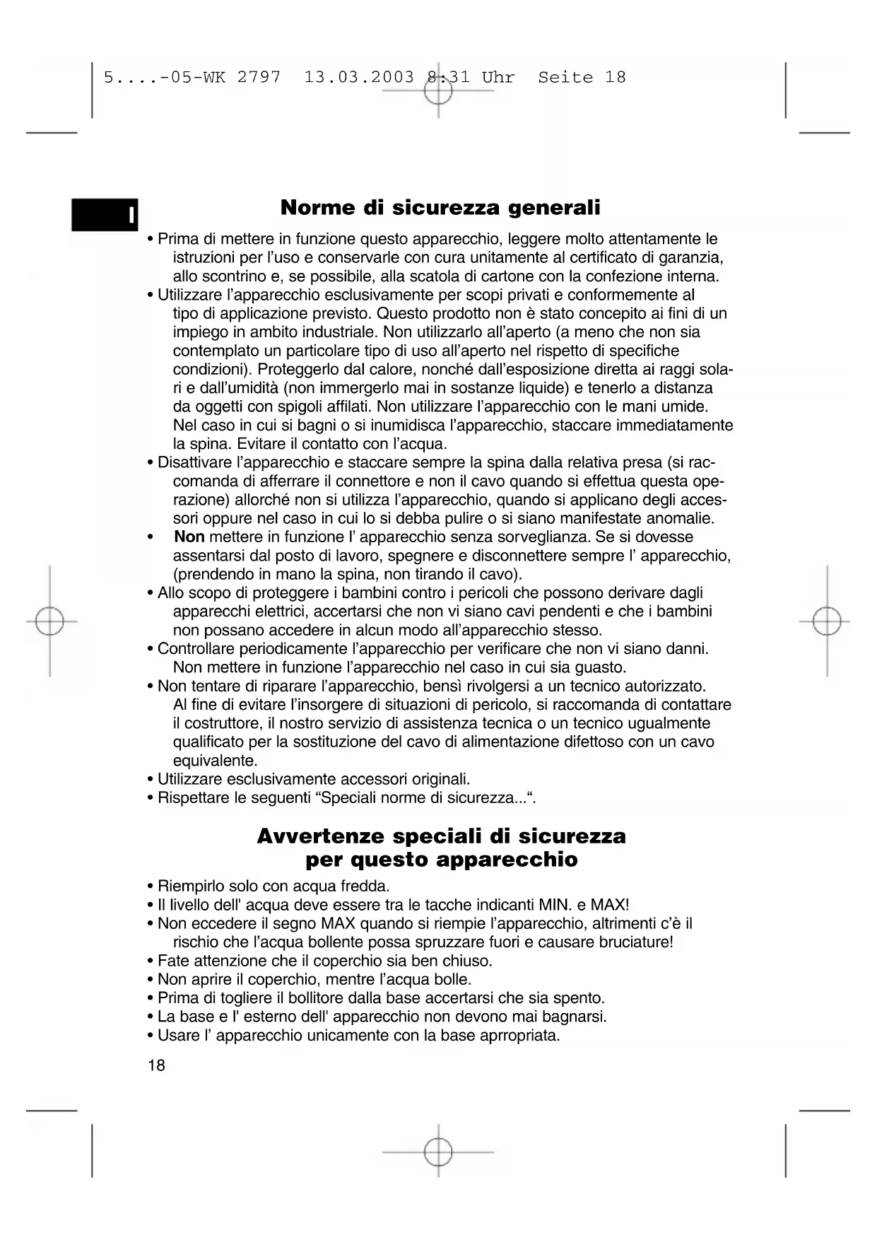 5....-05-WK 2797 13.03.2003 8:31 Uhr Seite 18Messa in funzione dell' apparecchio Per cortesia leggere attentamente queste istruzioni per l’uso e conservarle in un luogo sicuro. Prima di usare l’apparecchio per la prima volta far bollire due volte acqua fresca. Usare solo acqua fresca senza l’aggiunta di altre sostanze. Uso