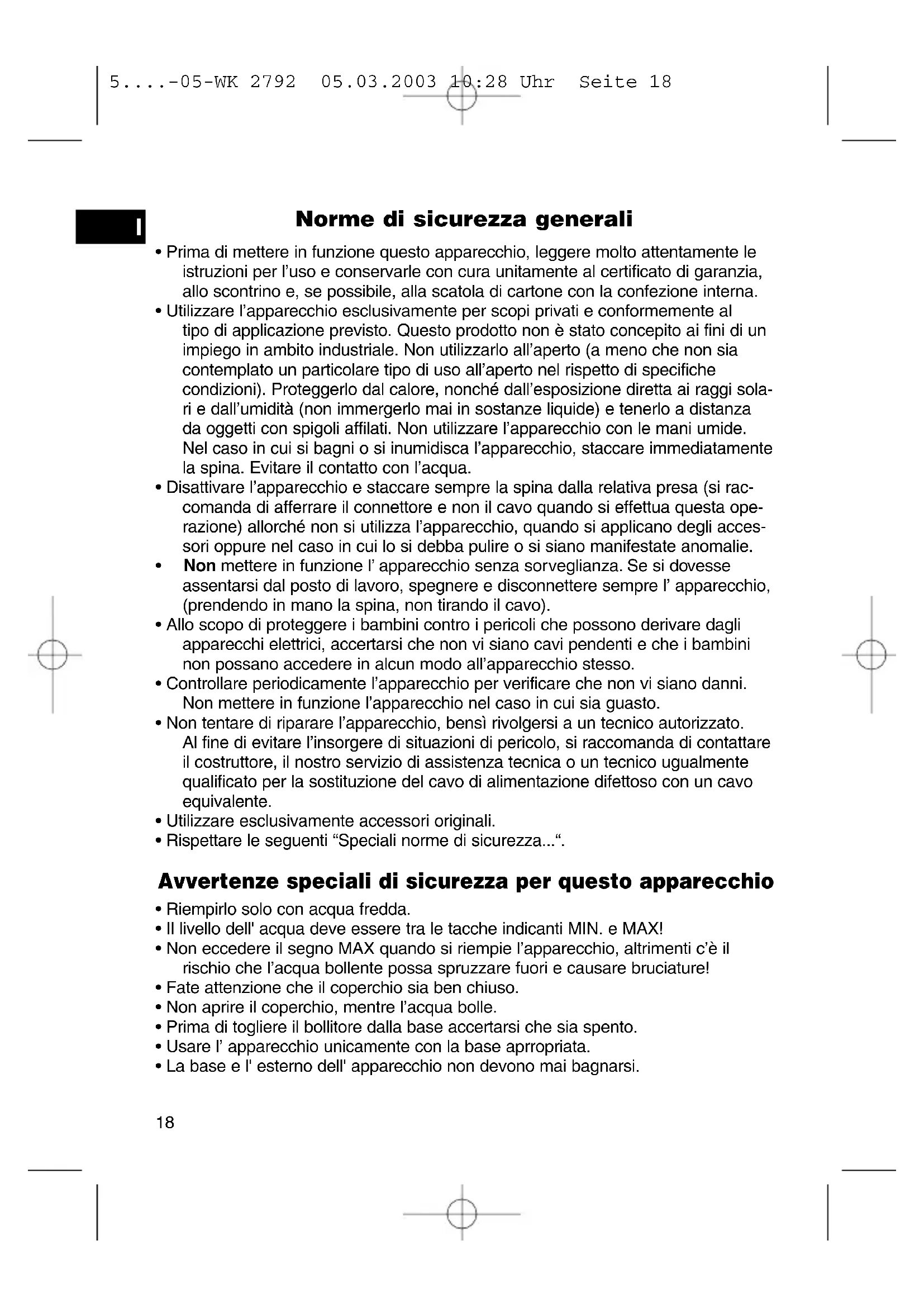 5....-05-WK 2792 05.03.2003 10:28 Uhr Seite 18Messa in funzione dell' apparecchio Per cortesia leggere attentamente queste istruzioni per l’uso e conservarle in un luogo sicuro. Prima di usare l’apparecchio per la prima volta far bollire due volte acqua fresca. Usare solo acqua fresca senza l’aggiunta di altre sostanze. Uso
