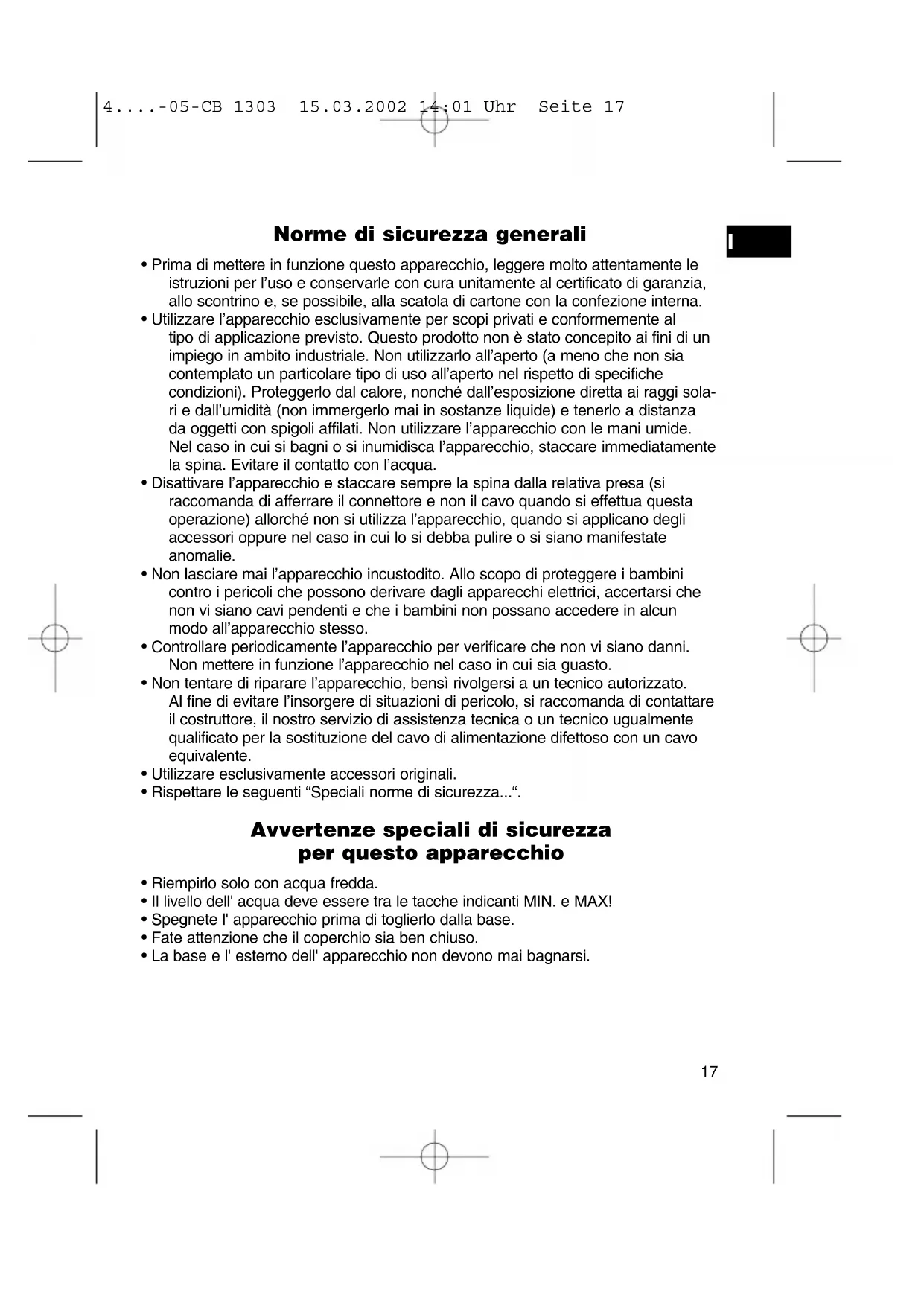 4....-05-CB 1303 15.03.2002 14:01 Uhr Seite 17Messa in funzione dell' apparecchio Per cortesia leggere attentamente queste istruzioni per l’uso e conservarle in un luogo sicuro. Prima di usare l’apparecchio per la prima volta far bollire due volte acqua fresca. Usare solo acqua fresca senza l’aggiunta di altre sostanze. Uso