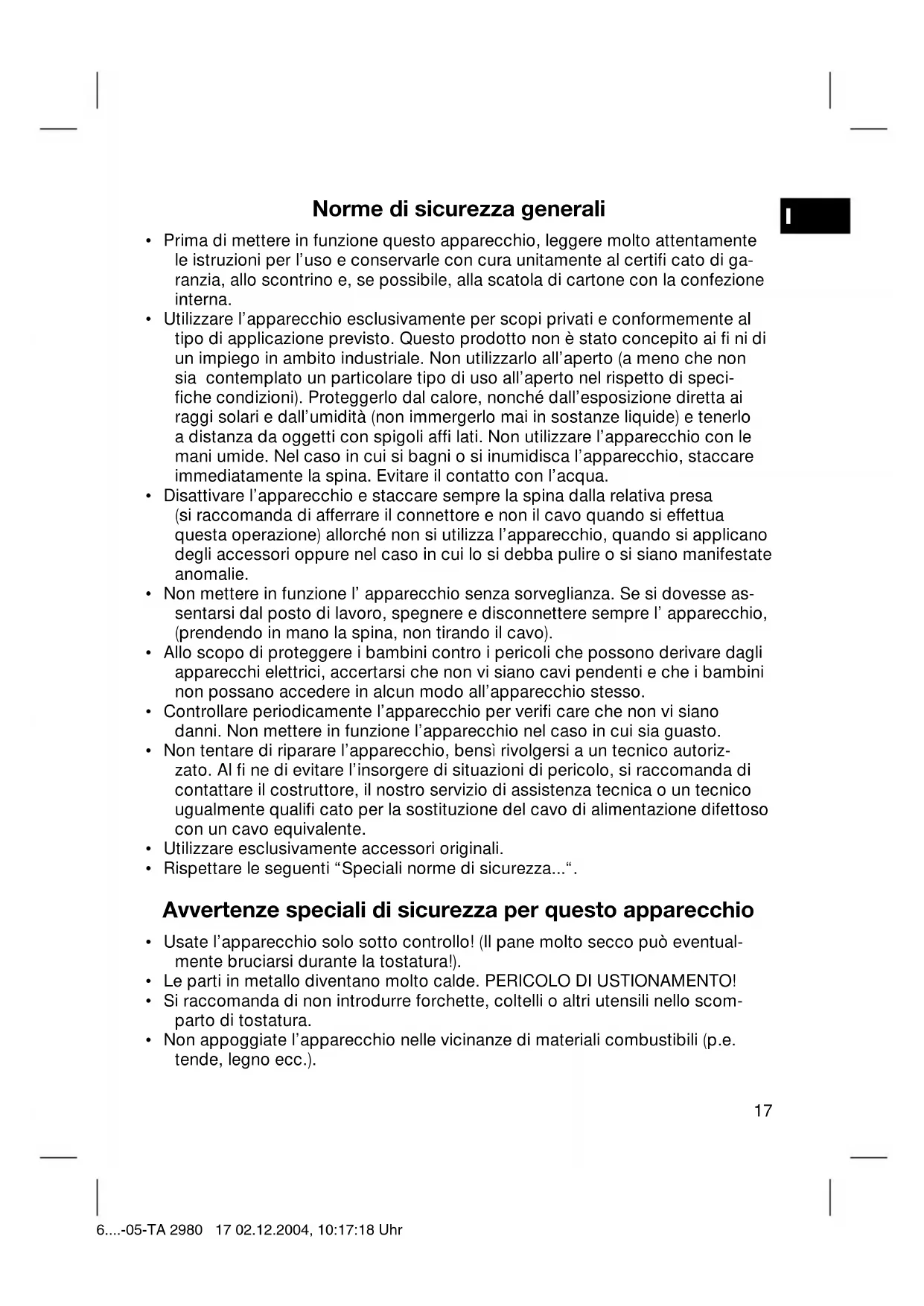 - Usate l'apparecchio solo sotto controlo! (Il pane molto secco può eventualmente bruciarsi durante la tostatura!).