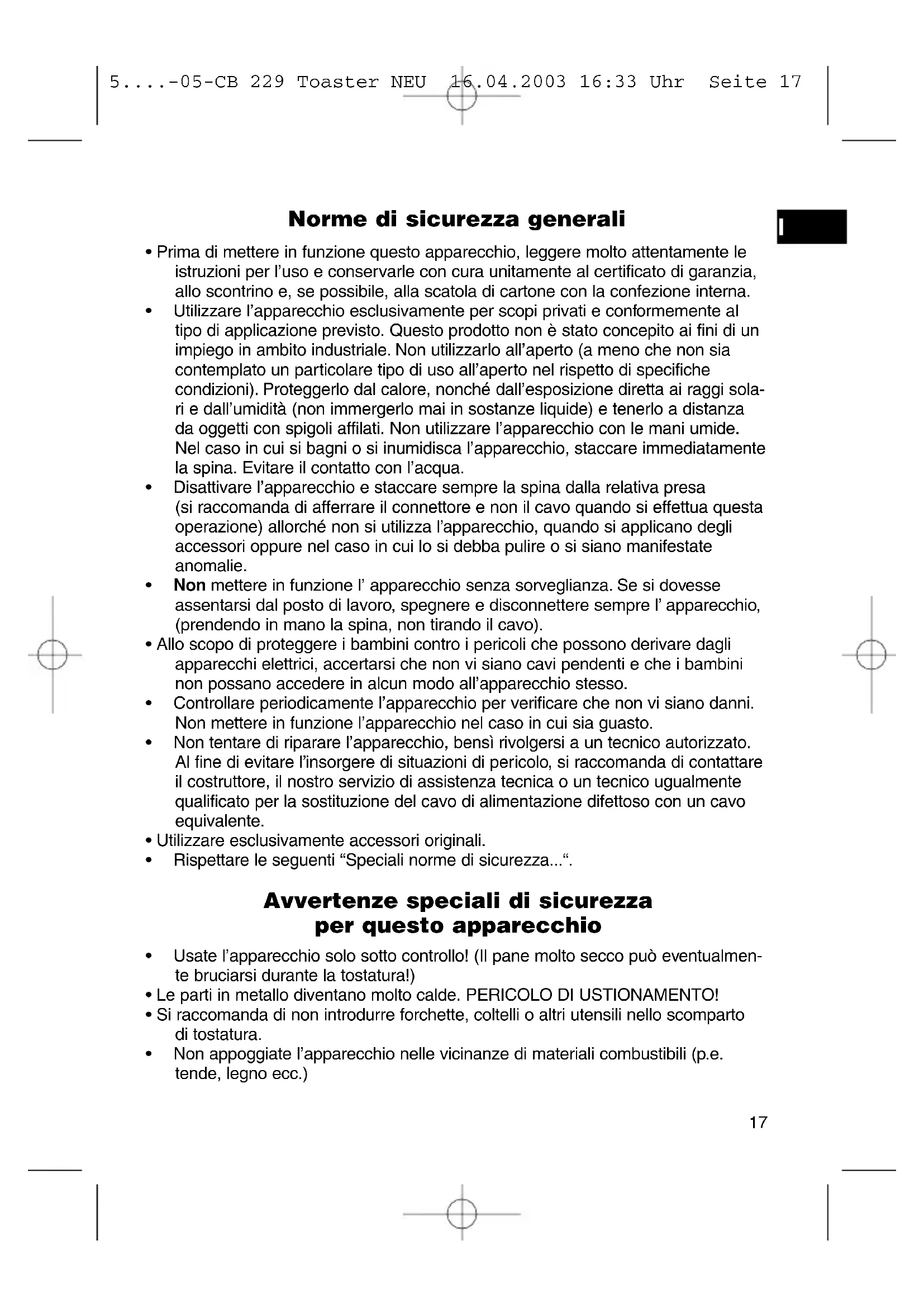 - Usate l'apparecchio solo sotto controllo! (Il pane molto secco può eventualmente bruciarsi durante la tostatura!)