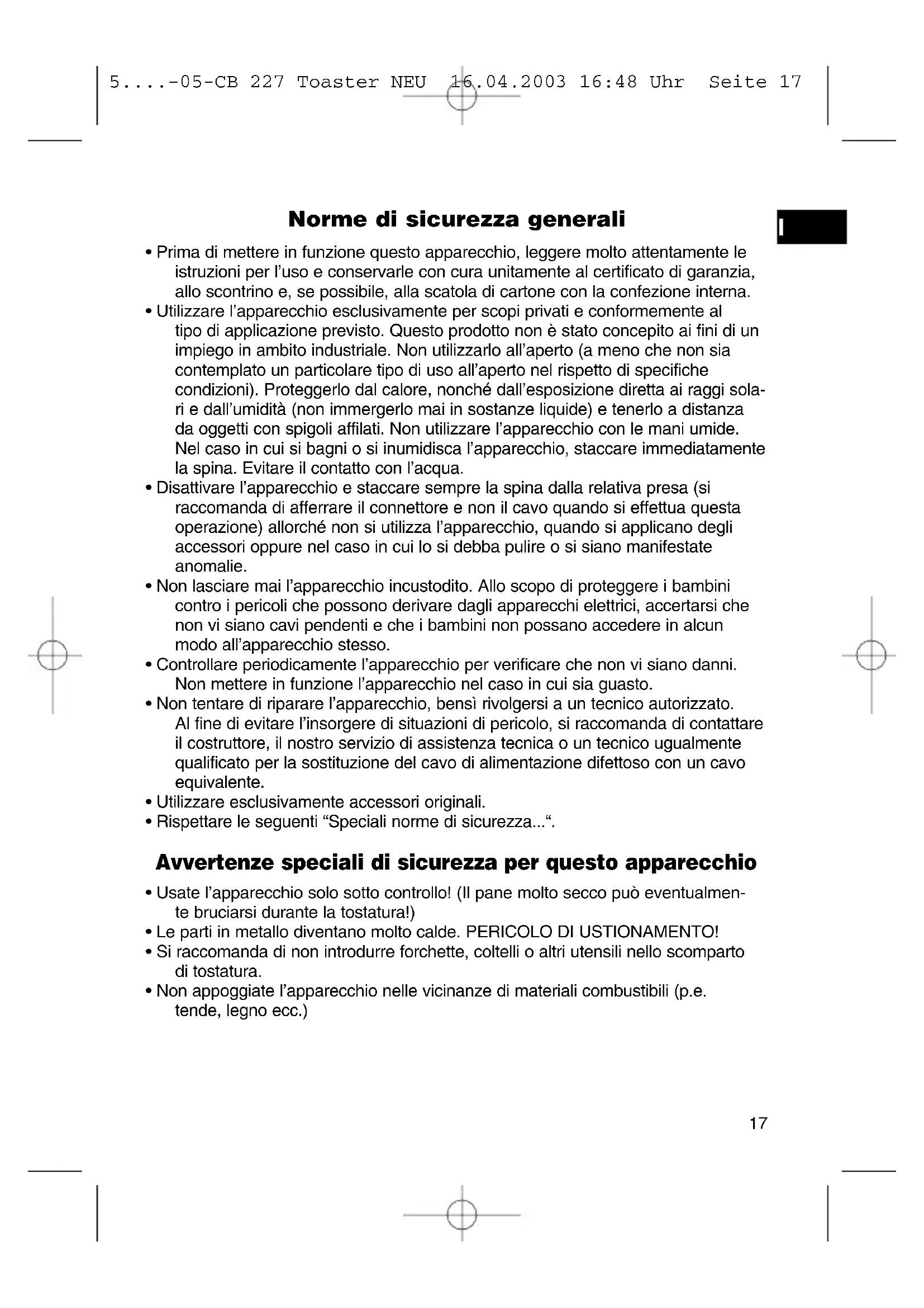 5....-05-CB 227 Toaster NEU 16.04.2003 16:48 Uhr Seite 17Prima del primo uso Per togliere lo strato di protezione dalla spirale, sarebbe meglio attivare l’ appa- recchio ca. tre volte senza contenuto. Sciegliere il livello di doratura desiderato. Facendo questo è possibile che si formi un leggero fumo e odore. Arieggiare sufficientemente. Uso