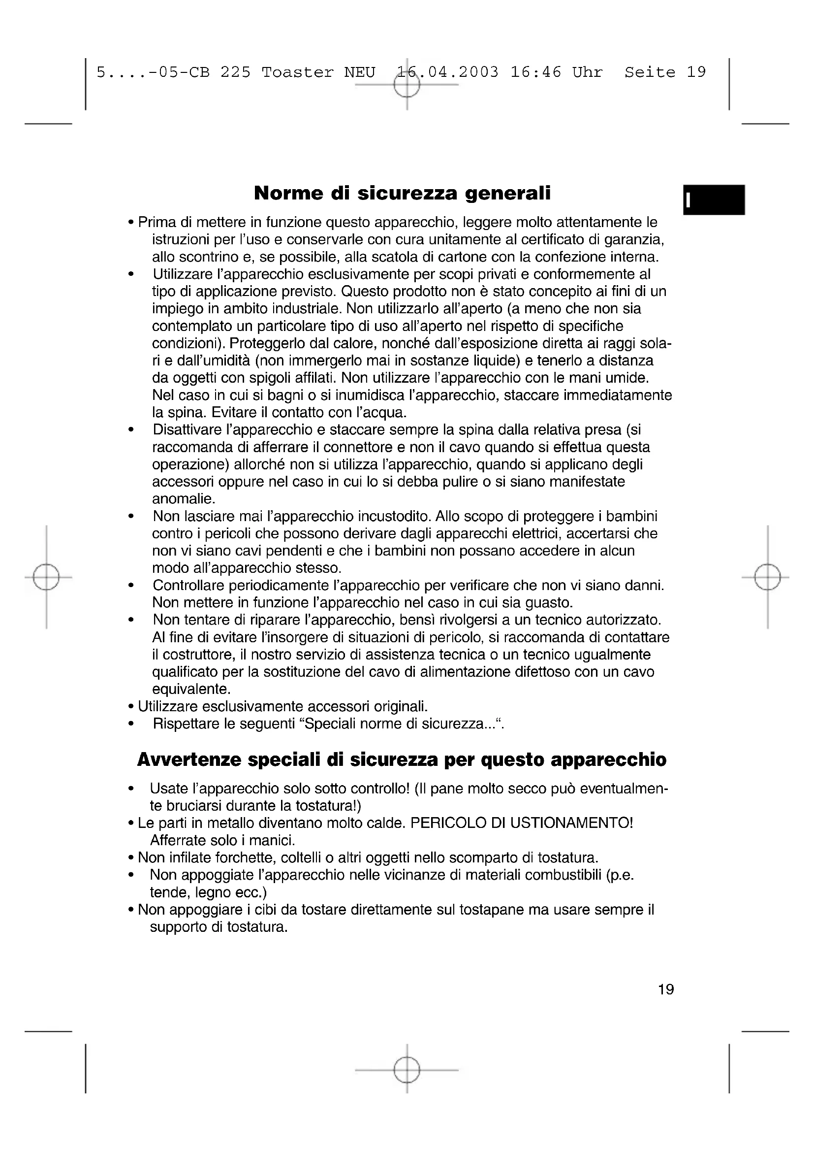 5....-05-CB 225 Toaster NEU 16.04.2003 16:46 Uhr Seite 20Questo apparecchio corrisponde alle norme CE per i disturbi radio e la sicurezza contro le correnti a basso voltaggio ed è stato costruito in base alle più recenti norme tecniche di sicurezza. Con riserva di apportare modifiche tecniche. Garanzia A partire dalla data di acquisto, questo prodotto è garantito dal produttore per un periodo di 24 mesi (scontrino). Durante la durata della garanzia, il produttore eliminerà gratuitamente difetti dell'- apparecchio dovuti a imperfezioni di produzione o di materiale, eventualmente cam- biando l' unità oppure procedendo con le dovute riparazioni. La garanzia è valida solo con lo scontrino. Senza l' esibizione dello scontrino non è possibile fare svolgere le riparazioni gratuitamente. In caso di riparazioni con garanzia, è necessario ritornare al produttore l' appa- recchio intero, nell'imballaggio originale, accompagnato dallo scontrino. In caso di rottura di vetro e difetti agli accessori, i pezzi necessari verranno spediti in cambio gratuitamente. In questo caso è necessario di non spedire l' intero appa- recchio, ma ordinare solo l' accessorio difettoso! Pulizia, manutenzione e scambio non fanno parte della garanzia e sono perciò sono soggetti a spese. La garanzia perde la sua validità se l'apparecchio è sottomesso all' intervento di terzi. Dopo la garanzia Quando la garanzia è scaduta, le riparazioni devono essere effettuate da un nego- zio od un servizio specializzato, contro pagamento.