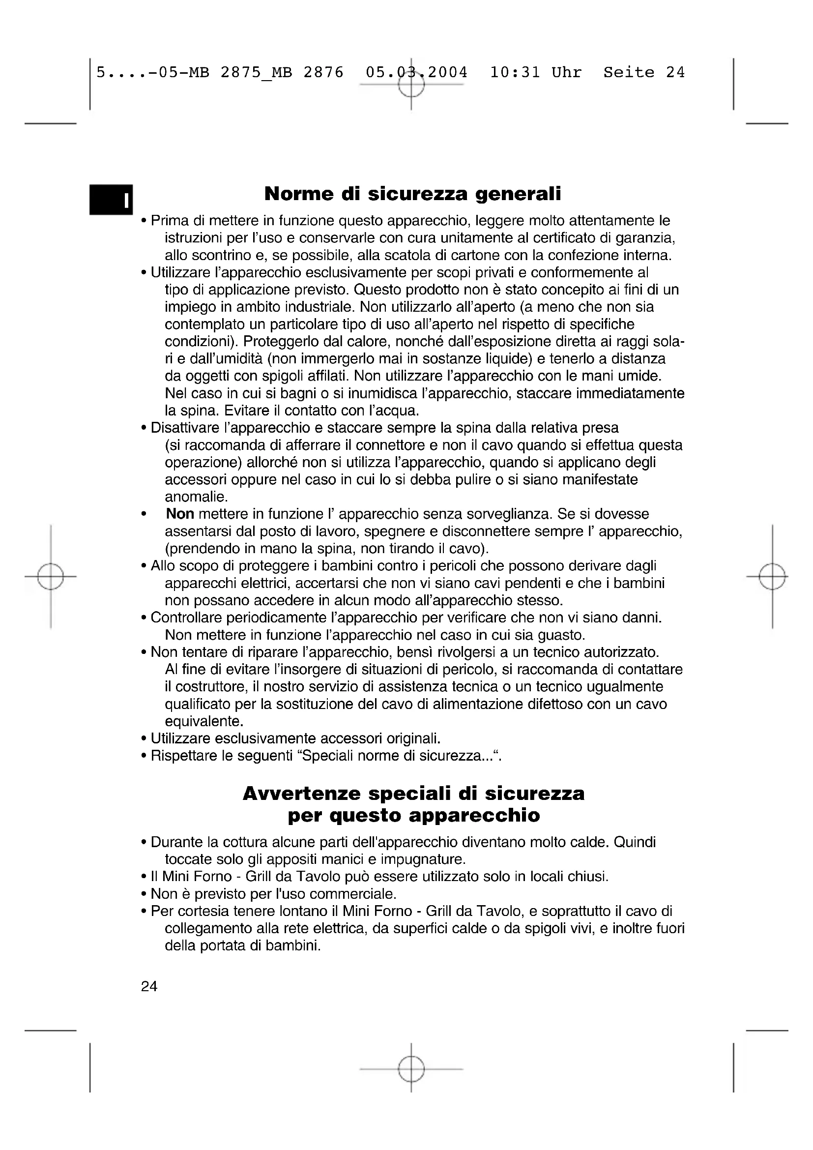 5....-05-MB 2875_MB 2876 05.03.2004 10:31 Uhr Seite 26*) Danni agli accessori non giustificano automaticamente lo scambio gratuito dell’- apparecchio completo. Si prega di mettersi in contatto con la nostra centrale telefo- nica. Danni alle parti di vetro oppure fratture ai pezzi di materia plastica sono obbli- gatoriamente a spese del cliente. La riparazione di pezzi d’uso ovvero soggetti a logoramento (cursori, ganci impa- statori, cinghie di trasmissione, telecomandi di ricambio, spazzolini di ricambio, lame di seghe ecc.) come anche operazioni di pulizia e manutenzione o la sostitu- zione di pezzi soggetti a logoramento non rientrano nella garanzia e quindi sono a pagamento! La garanzia si annulla nel caso di intervento da parte di terzi. Dopo la garanzia Al termine della garanzia le riparazioni possono essere eseguite dietro pagamento dal corrispettivo negozio specializzato o servizio riparazioni.