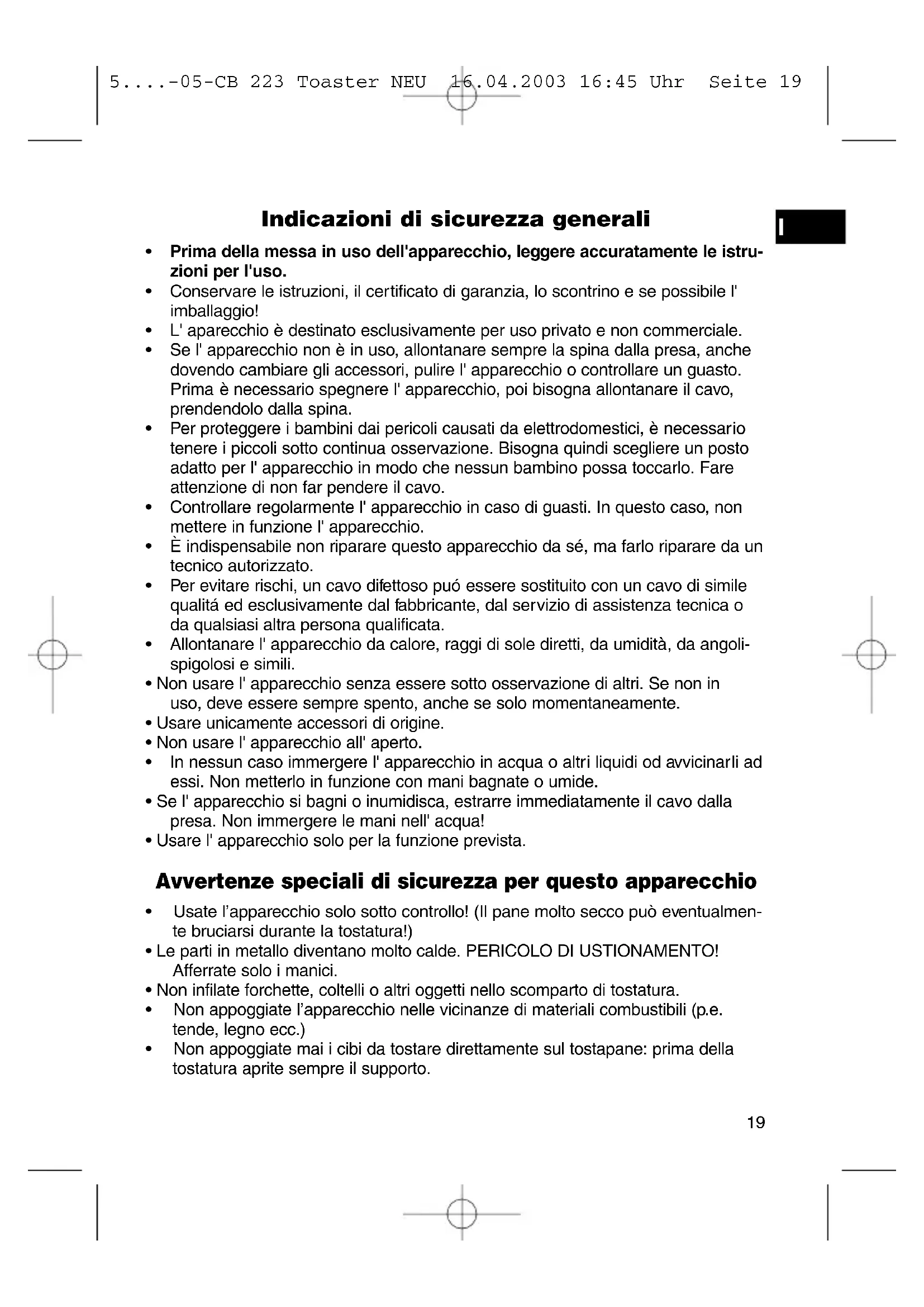 5....-05-CB 223 Toaster NEU 16.04.2003 16:45 Uhr Seite 20Questo apparecchio corrisponde alle norme CE per i disturbi radio e la sicurezza contro le correnti a basso voltaggio ed è stato costruito in base alle più recenti norme tecniche di sicurezza. Con riserva di apportare modifiche tecniche. Garanzia A partire dalla data di acquisto, questo prodotto è garantito dal produttore per un periodo di 24 mesi (scontrino). Durante la durata della garanzia, il produttore eliminerà gratuitamente difetti dell'- apparecchio dovuti a imperfezioni di produzione o di materiale, eventualmente cam- biando l' unità oppure procedendo con le dovute riparazioni. La garanzia è valida solo con lo scontrino. Senza l' esibizione dello scontrino non è possibile fare svolgere le riparazioni gratuitamente. In caso di riparazioni con garanzia, è necessario ritornare al produttore l' appa- recchio intero, nell'imballaggio originale, accompagnato dallo scontrino. In caso di rottura di vetro e difetti agli accessori, i pezzi necessari verranno spediti in cambio gratuitamente. In questo caso è necessario di non spedire l' intero appa- recchio, ma ordinare solo l' accessorio difettoso! Pulizia, manutenzione e scambio non fanno parte della garanzia e sono perciò sono soggetti a spese. La garanzia perde la sua validità se l'apparecchio è sottomesso all' intervento di terzi. Dopo la garanzia Quando la garanzia è scaduta, le riparazioni devono essere effettuate da un nego- zio od un servizio specializzato, contro pagamento.