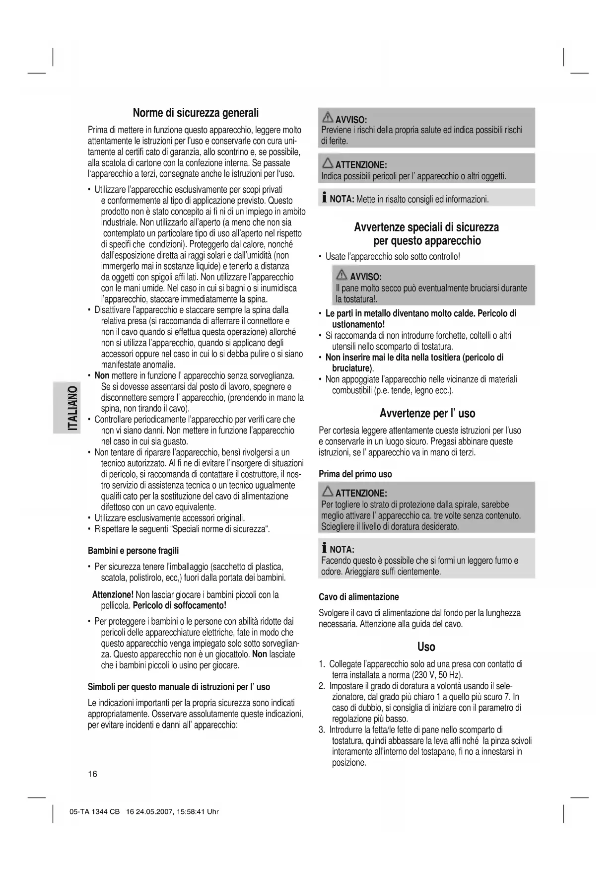 - Usate l’apparecchio solo sotto controllo! AVVISO: Il pane molto secco può eventualmente bruciarsi durante la tostatura!.