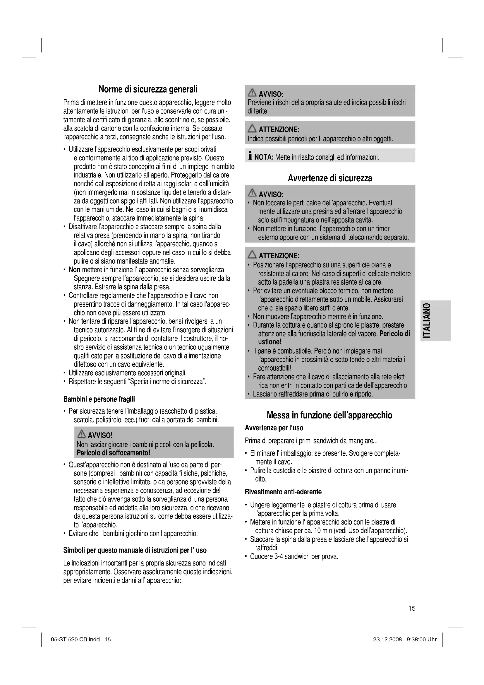 - Lavare le piastre di cottura con una spugna morbida e ac- qua e detersivo per stoviglie, sciacquare con acqua corrente e asciugare con un panno morbido. Dopo l’asciugatura applicare uno strato sottile di olio alimentare sulla superfi cie. Custodia Dopo l’uso pulire l’apparecchio con un panno leggermente inumidito. Dati tecnici Modello: ........................................................................ST 520 CB Alimentazione rete: ............................................ Consumo di energia: ........................................................... 750 W Classe di protezione: .................................................................... Ι Peso netto: ........................................................................1,00 kg Questo apparecchio è stato controllato sulla base di tutte le direttive CE attuali in vigore in questo settore, quali per esempio la normativa in materia di compatibilità elettromagnetica e la direttiva in materia di bassa tensione, ed è stato costruito confor- memente alle norme di sicurezza più moderne. Con riserva di apportare modifi che tecniche. Signifi cato del simbolo „Eliminazione“ Salvaguardare l’ ambiente, gli elettrodomestici non vanno elimi- nati come rifi uti domestici. Per l’ eliminazione degli elettrodomestici, fare uso dei posti di raccolta previsti per questo tipo e porre quegli elettrodomestici che non sono più in uso. Si contribuisce così ad evitare un effetto potenziale sull’ ambien- te e sulla salute, dovuto magari ad una eliminazione sbagliata. Questo signifi ca un contributo personale alla riutilizzazione, al riciclaggio e altre forme di utilizzazione di elettrodomestici ed apparecchi elettronici usati. 05-ST 520 CB.indd 1605-ST 520 CB.indd 16 23.12.2008 9:38:00 Uhr23.12.2008 9:38:00 Uhr 220-240 V, 50 Hz17 ITALIANO ITALIANO Si possono trovare le corrispondenti informazioni sugli appositi luoghi di raccolta, nelle amministrazioni dei comuni. 05-ST 520 CB.indd 1705-ST 520 CB.indd 17 23.12.2008 9:38:00 Uhr23.12.2008 9:38:00 Uhr18 NORSK NORSK Generelle sikkerhetsanvisninger Les nøye gjennom bruksanvisningen før du tar apparatet i bruk. Ta godt vare på bruksanvisningen, garantibeviset, kassalappen og helst også esken med innvendig emballasje. Gis apparatet videre til en tredjeperson, må bruksanvisningen også følge med.