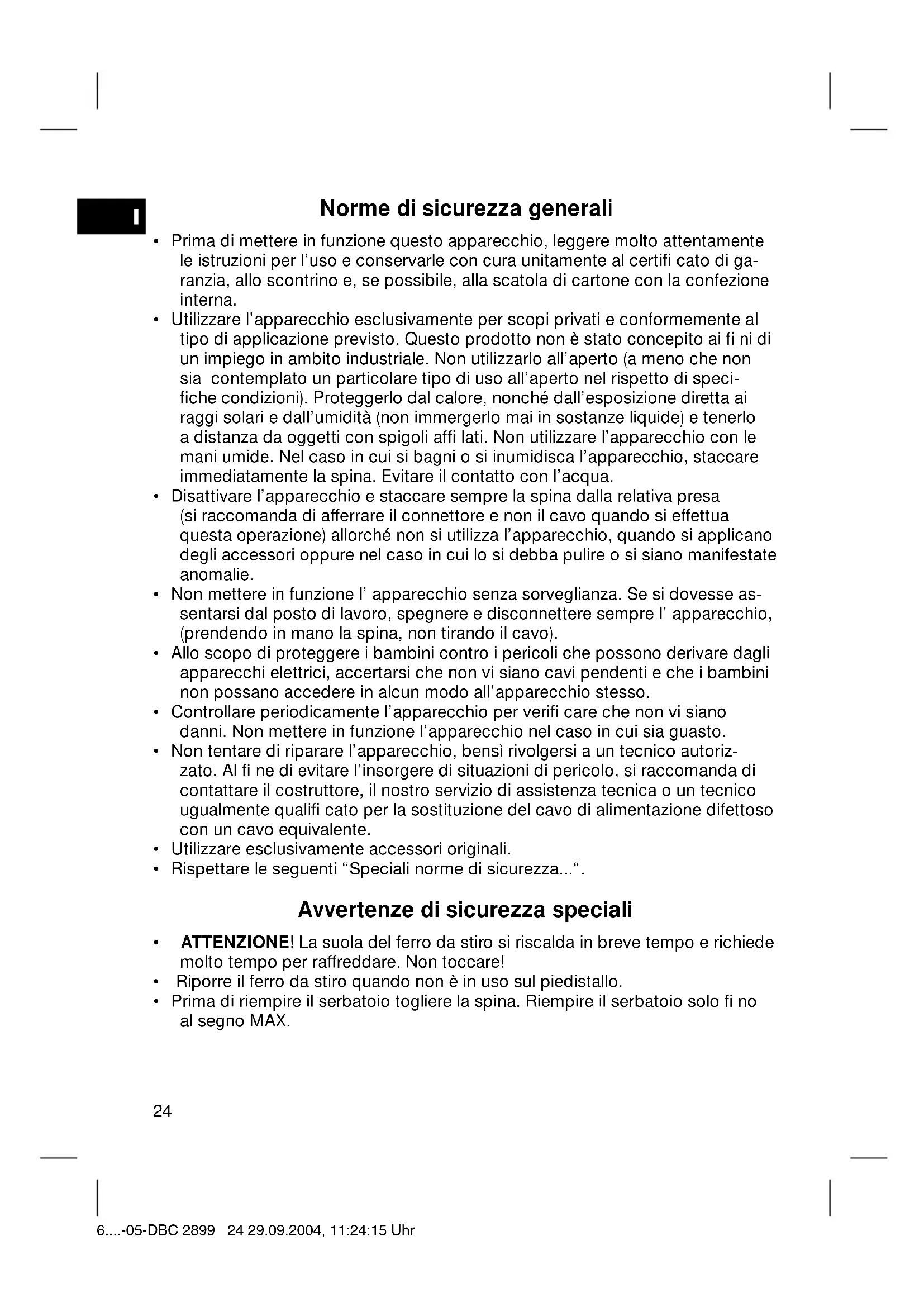 - Dopo l’ uso mettere il rogolatore per la quantità di vapore sempre in posizione “쎲” e svuotare completamente il serbatoio per evitare una fuoriuscita d’ acqua dal serbatoio. Questo apparecchio è stato controllato sulla base di tutte le direttive CE attuali in vigore in questo settore, quali per esempio la normativa in materia di compatibili- tà elettromagnetica e la direttiva in materia di bassa tensione, ed è stato costruito conformemente alle norme di sicurezza più moderne. Con riserva di apportare modifi che tecniche. Garanzia Per l’apparecchio da noi messo in commercio ci assumiamo una garanzia di 24 mesi dalla data di acquisto (scontrino). Durante la garanzia noi ci impegniamo ad eliminare gratuitamente i guasti dell’apparecchio o degli accessori*), dovuti a difetti di materiale o di fabbricazi- one, riparandoli o, a nostra discrezione, sostituendoli. Le prestazioni in garanzia danno luogo a una proroga della garanzia né danno diritto ad una nuova garan- zia! Per la garanzia è suffi ciente lo scontrino di acquisto. Senza questo scontrino non sussiste il diritto né ad una sostituzione né ad una riparazione gratuita. Nel caso si ricorra alla garanzia, restituire al rivenditore l’apparecchio completo in ogni sua parte, nell’imballaggio originale unitamente allo scontrino. *) Danni agli accessori non giustifi cano automaticamente lo scambio gratuito dell’apparecchio completo. Si prega di mettersi in contatto con la nostra centrale telefonica. Danni alle parti di vetro oppure fratture ai pezzi di materia plastica sono obbligatoriamente a spese del cliente. La riparazione di pezzi d’uso ovvero soggetti a logoramento (cursori, ganci im- pastatori, cinghie di trasmissione, telecomandi di ricambio, spazzolini di ricambio, lame di seghe ecc.) come anche operazioni di pulizia e manutenzione o la sostitu- zione di pezzi soggetti a logoramento non rientrano nella garanzia e quindi sono a pagamento! La garanzia si annulla nel caso di intervento da parte di terzi. Dopo la garanzia Al termine della garanzia le riparazioni possono essere eseguite dietro pagamento dal corrispettivo negozio specializzato o servizio riparazioni. 6....-05-DBC 2899 27 29.09.2004, 11:24:17 UhrN