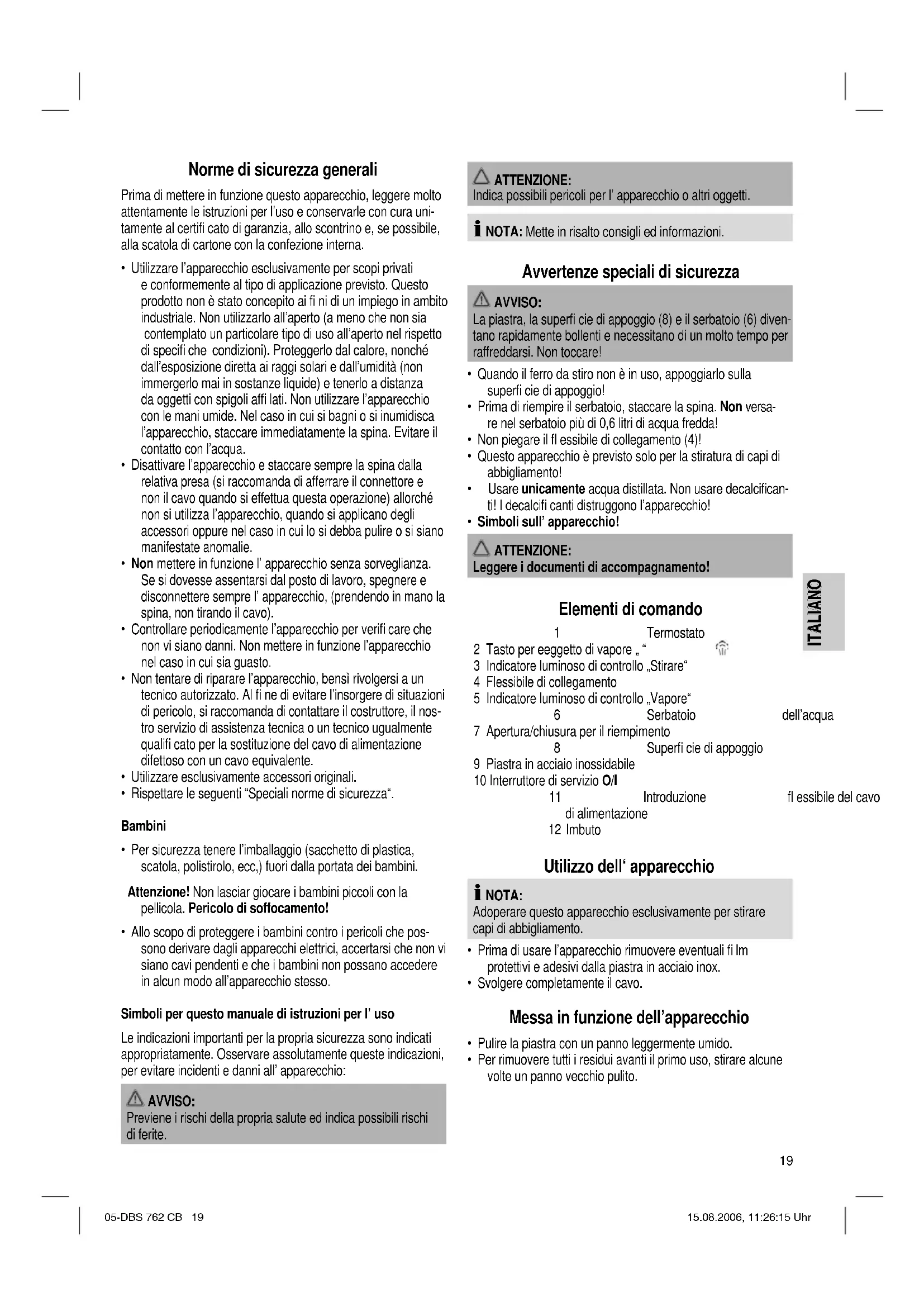 - Per rimuovere tutti i residui avanti il primo uso, stirare alcune volte un panno vecchio pulito. 05-DBS 762 CB 19 15.08.2006, 11:26:15 Uhr20 ITALIANO ITALIANO