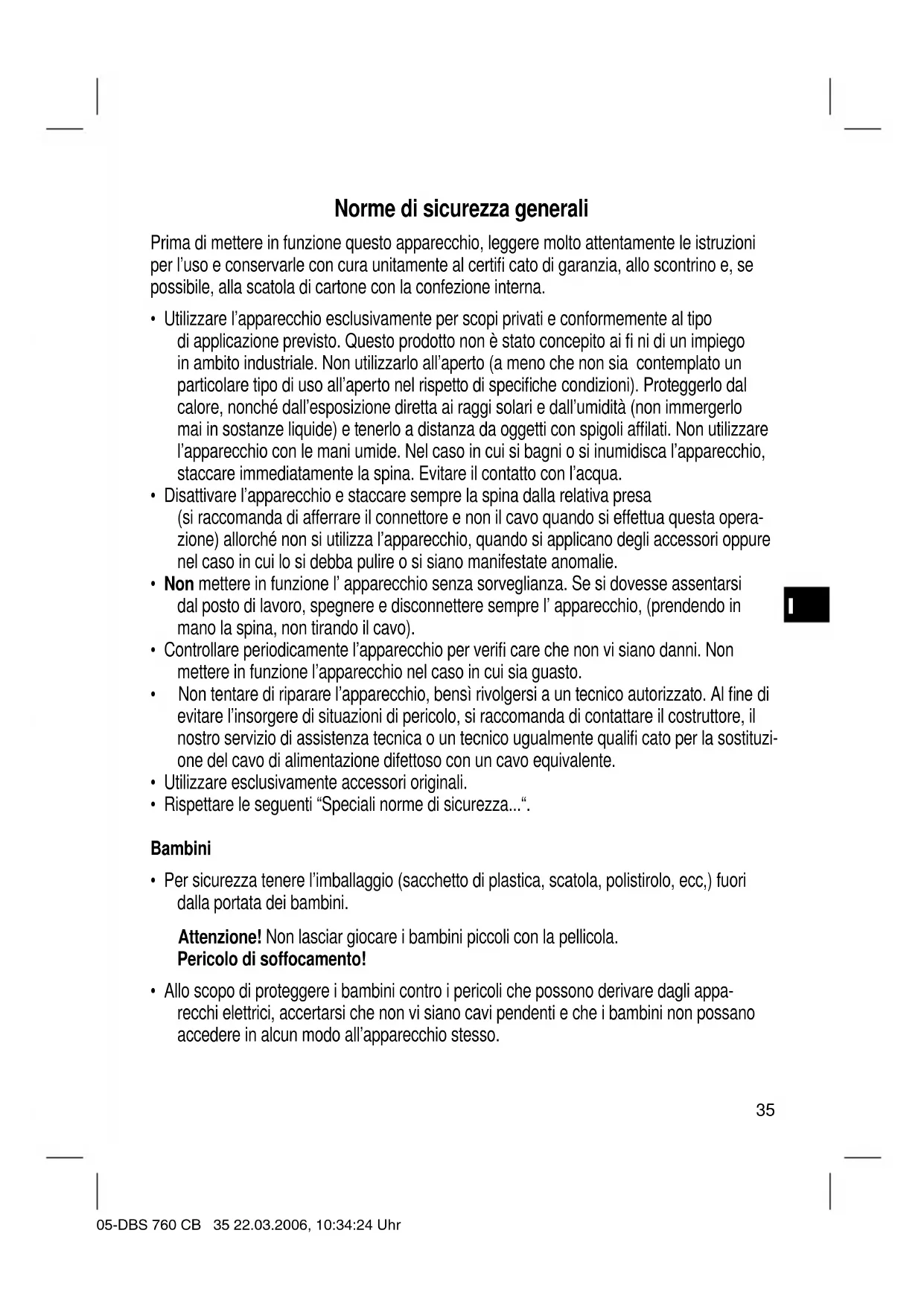 - Allo scopo di proteggere i bambini contro i pericoli che possono derivare dagli appa- recchi elettrici, accertarsi che non vi siano cavi pendenti e che i bambini non possano accedere in alcun modo all’apparecchio stesso. 05-DBS 760 CB 35 22.03.2006, 10:34:24 UhrI