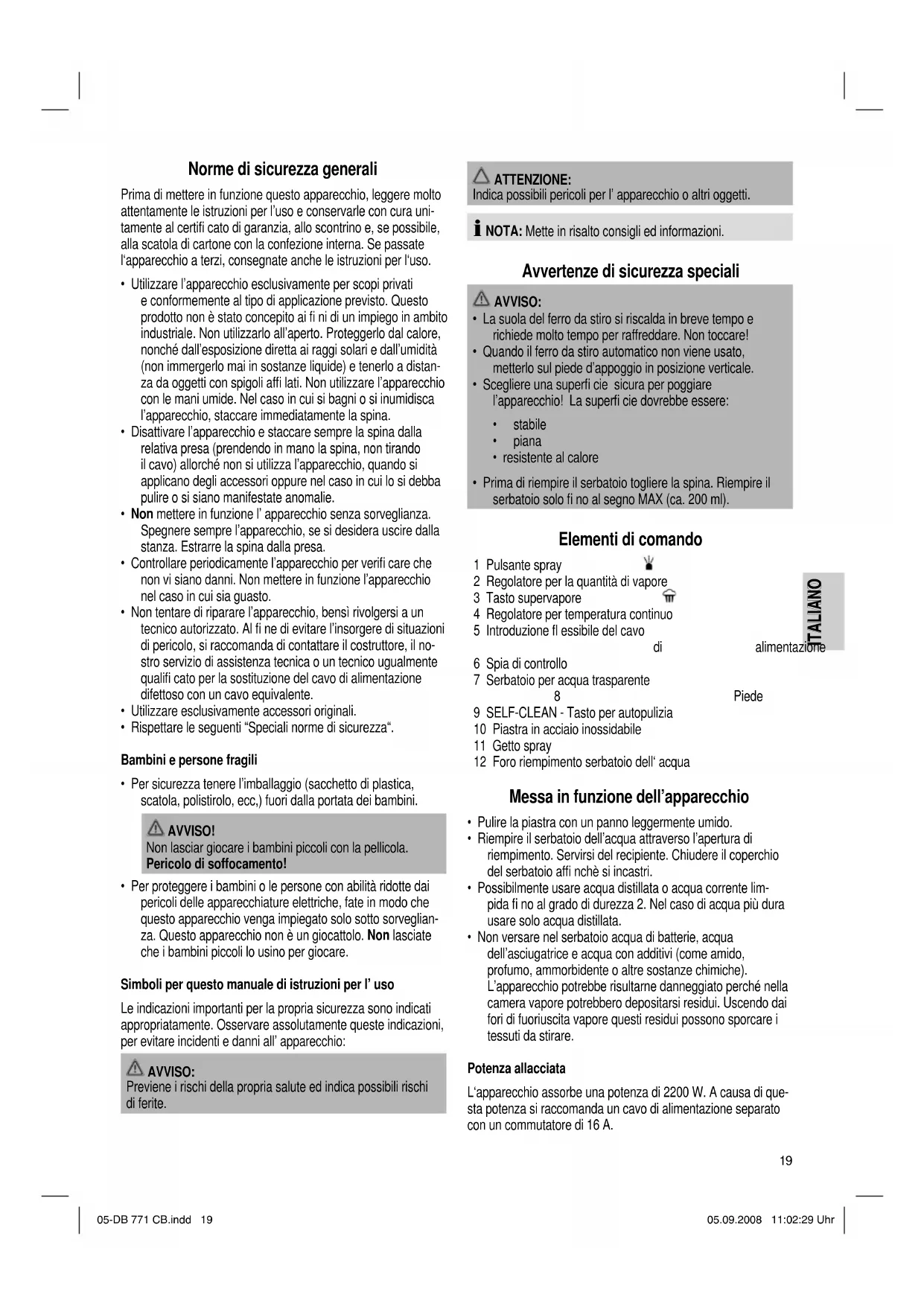 - Non versare nel serbatoio acqua di batterie, acqua dell’asciugatrice e acqua con additivi (come amido, profumo, ammorbidente o altre sostanze chimiche). L’apparecchio potrebbe risultarne danneggiato perché nella camera vapore potrebbero depositarsi residui. Uscendo dai fori di fuoriuscita vapore questi residui possono sporcare i tessuti da stirare. Potenza allacciata L‘apparecchio assorbe una potenza di 2200 W. A causa di que- sta potenza si raccomanda un cavo di alimentazione separato con un commutatore di 16 A. 05-DB 771 CB.indd 1905-DB 771 CB.indd 19 05.09.2008 11:02:29 Uhr05.09.2008 11:02:29 Uhr20 ITALIANO ITALIANO ATTENZIONE: SOVRACCARICO A causa della potenza di questo apparecchio, non fare uso di cavi di prolungamento oppure di prese multiple. Utilizzo dell‘ apparecchio NOTA: Con questo apparecchio si stirano unicamente capi di abbigli- amento e tessuti!