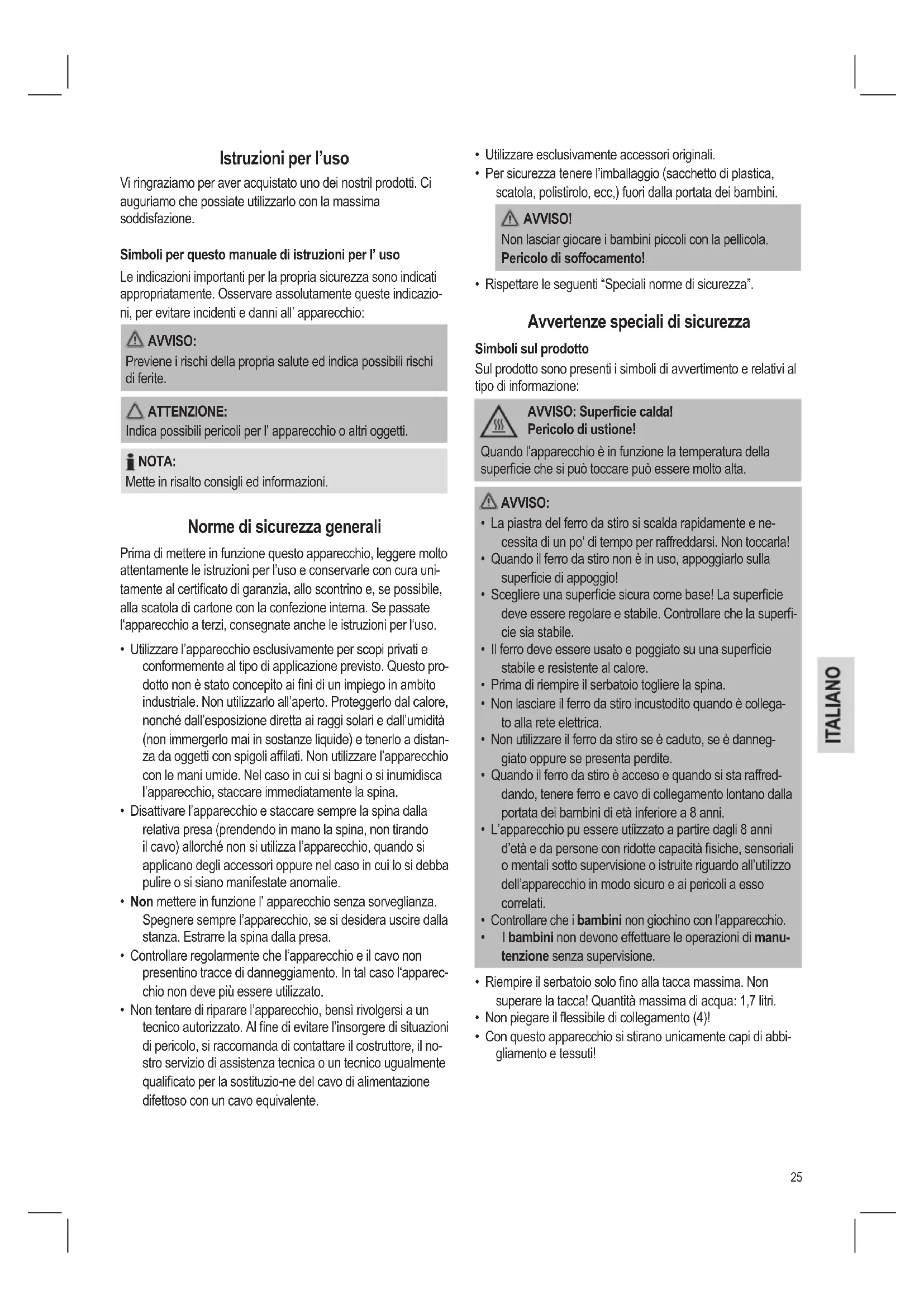 - Con questo apparecchio si stirano unicamente capi di abbi- gliamento e tessuti! Istruzioni per l’uso Vi ringraziamo per aver acquistato uno dei nostril prodotti. Ci auguriamo che possiate utilizzarlo con la massima soddisfazione. Simboli per questo manuale di istruzioni per l’ uso Le indicazioni importanti per la propria sicurezza sono indicati appropriatamente. Osservare assolutamente queste indicazio- ni, per evitare incidenti e danni all’ apparecchio: AVVISO: Previene i rischi della propria salute ed indica possibili rischi di ferite. ATTENZIONE: Indica possibili pericoli per l’ apparecchio o altri oggetti. NOTA: Mette in risalto consigli ed informazioni. Norme di sicurezza generali Prima di mettere in funzione questo apparecchio, leggere molto attentamente le istruzioni per l’uso e conservarle con cura uni- tamente al certicato di garanzia, allo scontrino e, se possibile, alla scatola di cartone con la confezione interna. Se passate l‘apparecchio a terzi, consegnate anche le istruzioni per l‘uso.