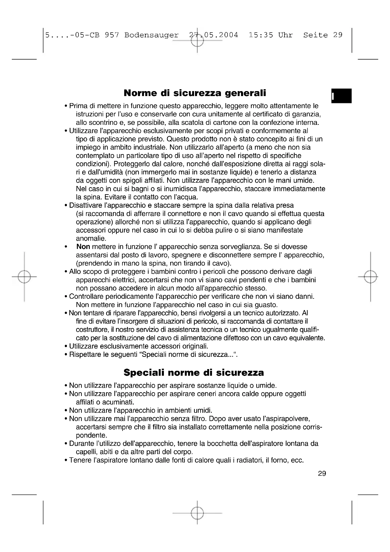 - Bocchetta per cuscini 5....-05-CB 957 Bodensauger 27.05.2004 15:35 Uhr Seite 30Regolatore della potenza di aspirazione: Potenza di aspirazione bassa: per tende e materiali delicati Potenza di aspirazione media: per tappeti in velluto a pelo lungo e per pavimenti in tessuto Potenza di aspirazione elevata: per pavimenti e tappeti robusti Dispositivo avvolgicavo per il cavo di allacciamento alla rete: Si raccomanda di estrarre il cavo soltanto fino al contrassegno in colore giallo. Non tirare mai, in nessun caso, il cavo sino al contrassegno rosso, in quanto il dispositi- vo avvolgicavo potrebbe danneggiarsi. I danni di questo genere non sono coperti da garanzia. Riavvolgimento del cavo: Premere il pulsante relativo al dispositivo avvolgicavo e accompagnare il cavo con la mano. Si consiglia di tenere il cavo, in modo da impedire movimenti violenti e dis- ordinati del medesimo. Bocchette:
