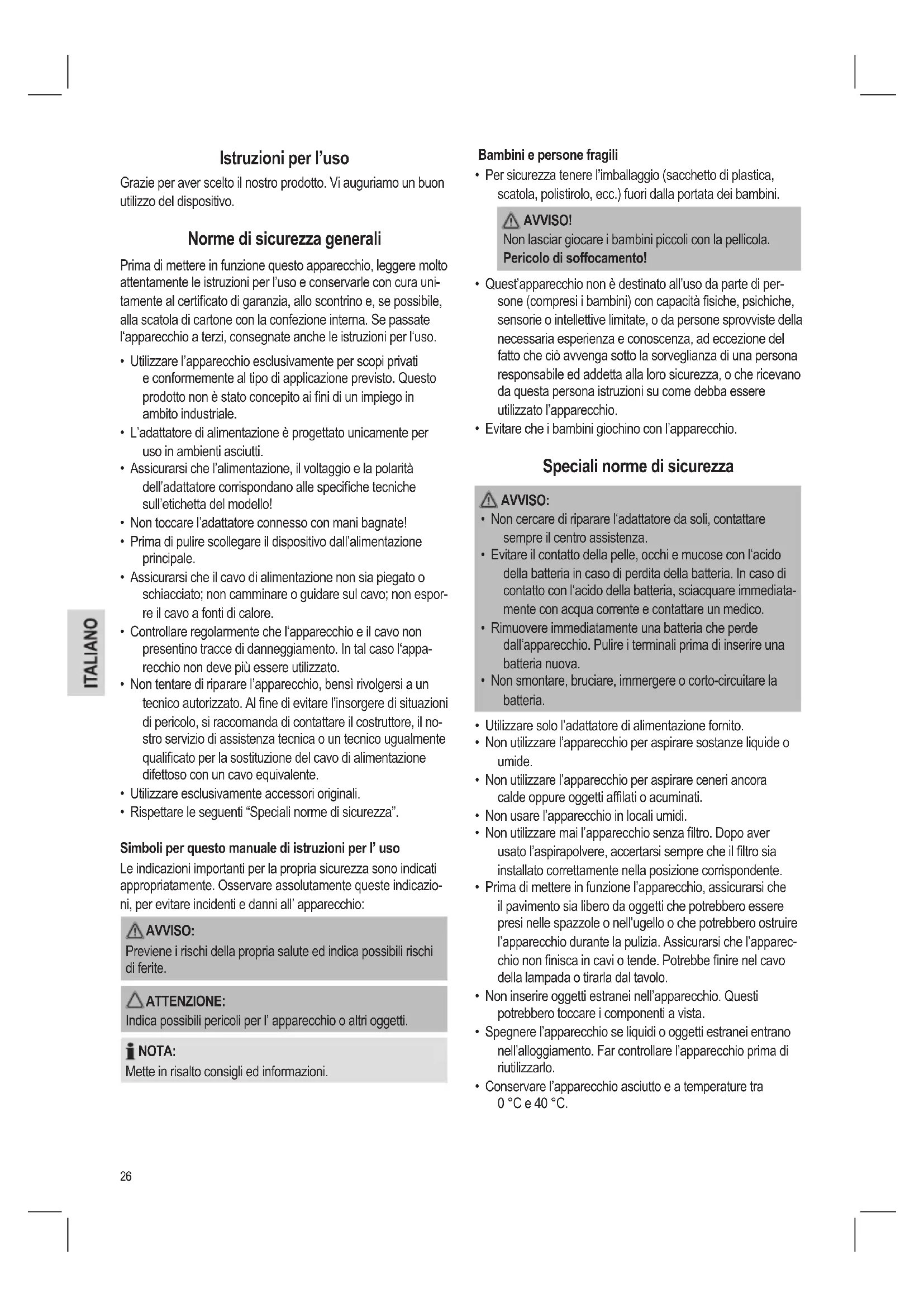 - Evitare che i bambini giochino con l’apparecchio. Speciali norme di sicurezza AVVISO: