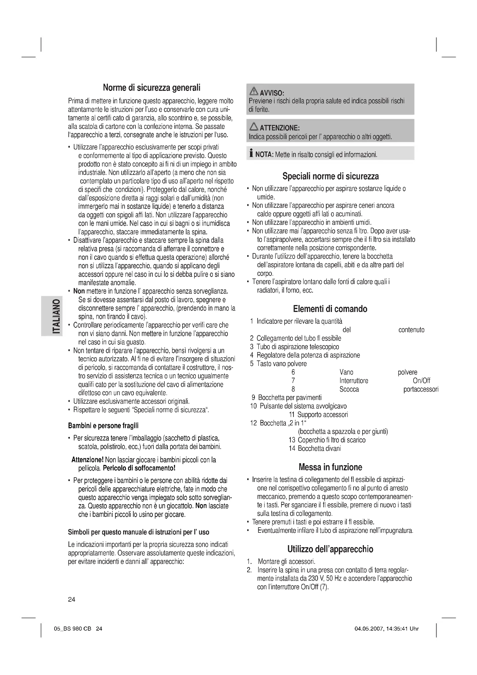 - Inserire il gancio del bocchetto nel dispositivo di arrestamen- to sulla parte posteriore dell‘ apparecchio (8). 05_BS 980 CB 26 04.05.2007, 14:35:44 UhrITALIANO