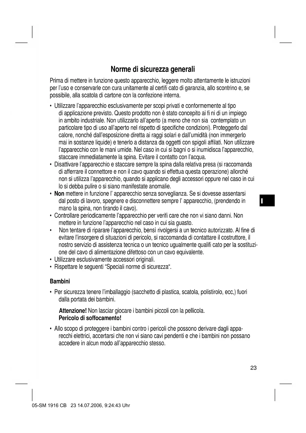 - Allo scopo di proteggere i bambini contro i pericoli che possono derivare dagli appa- recchi elettrici, accertarsi che non vi siano cavi pendenti e che i bambini non possano accedere in alcun modo all’apparecchio stesso. 05-SM 1916 CB 23 14.07.2006, 9:24:43 UhrI