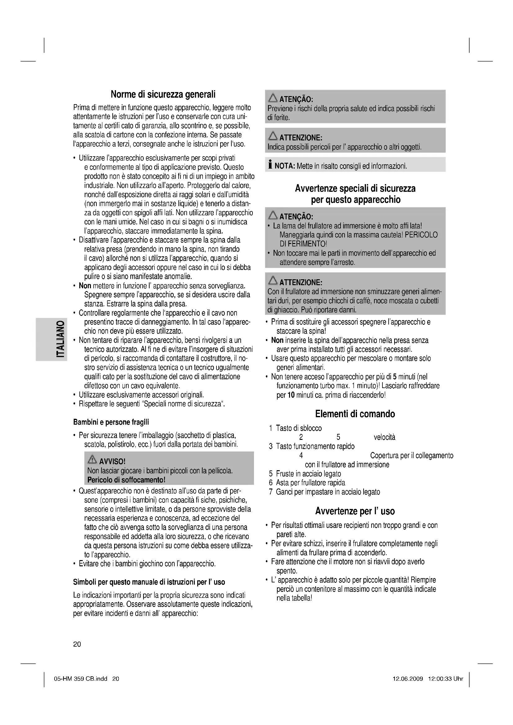 - L’ apparecchio è adatto solo per piccole quantità! Riempire perciò un contenitore al massimo con le quantità indicate nella tabella! 05-HM 359 CB.indd 2005-HM 359 CB.indd 20 12.06.2009 12:00:33 Uhr12.06.2009 12:00:33 Uhr21 ITALIANO ITALIANO Frullatore ad immersione rapido (6) Spezzare i pezzi più grossi di alimenti solidi prima di passarli (max. Ø 1,5 cm) ed aggiungere un po’ di liquido. Funzionamento rapido (turbo) (3) Per passare in breve tempo al numero massimo di giri. Pre- mendo a brevi intervalli potete lavorare con il funzionamento ad impulsi. ATTENZIONE: non utilizzate questa funzione per più di 1 minuto. Messa in funzione Preparazione