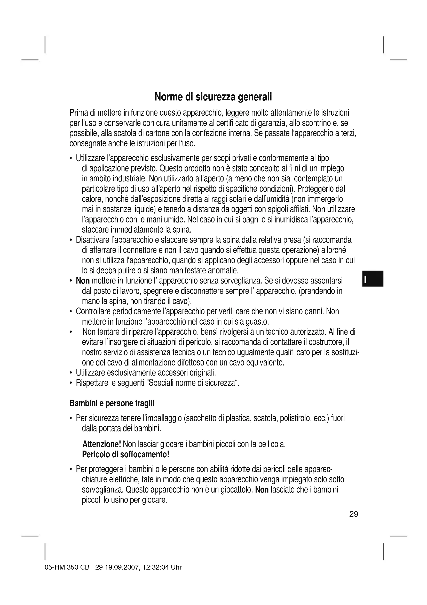 - Per proteggere i bambini o le persone con abilità ridotte dai pericoli delle apparec- chiature elettriche, fate in modo che questo apparecchio venga impiegato solo sotto sorveglianza. Questo apparecchio non è un giocattolo. Non lasciate che i bambini piccoli lo usino per giocare. 05-HM 350 CB 29 19.09.2007, 12:32:04 UhrI