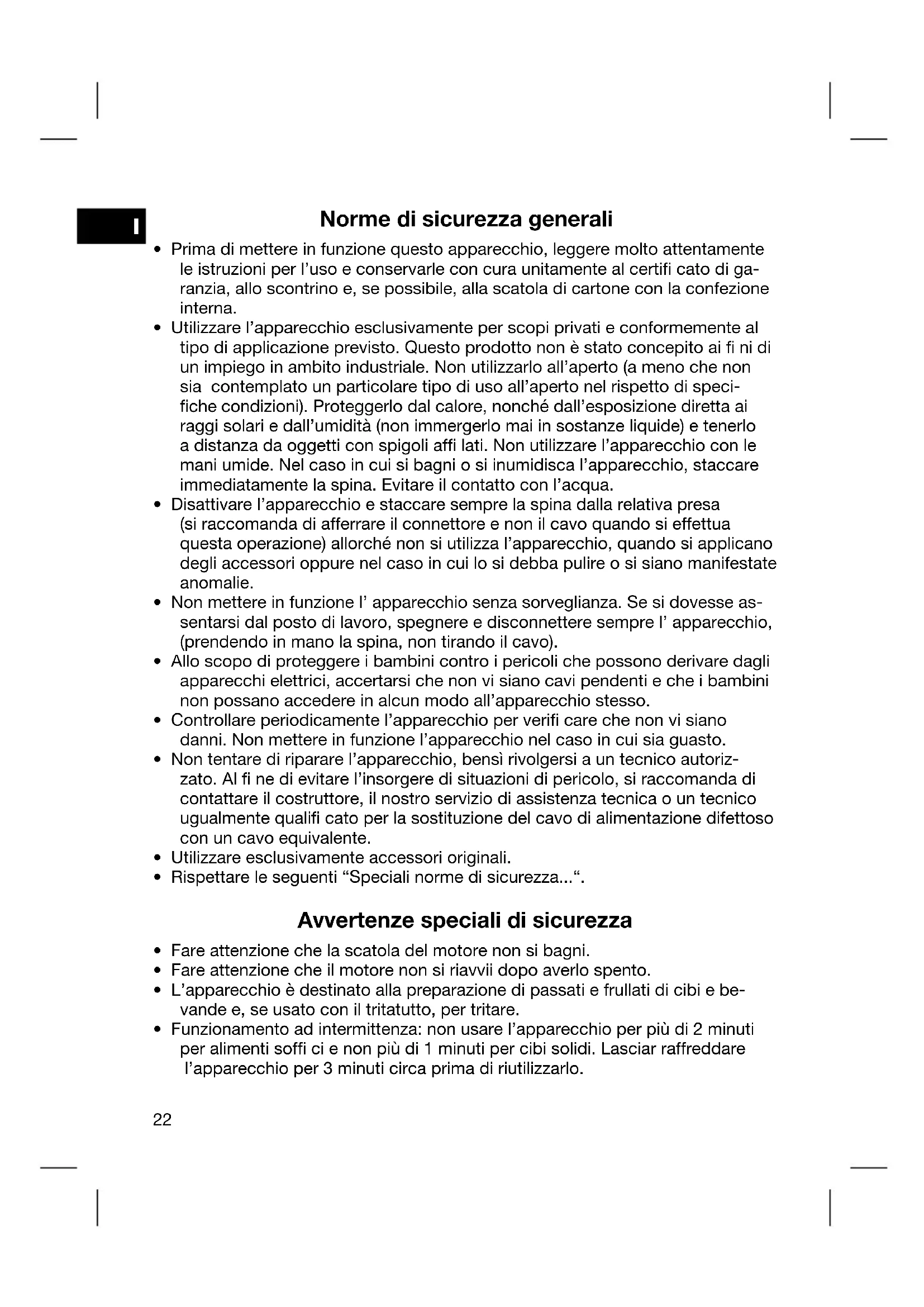 - Rispettare le seguenti “Speciali norme di sicurezza...“. Avvertenze speciali di sicurezza
