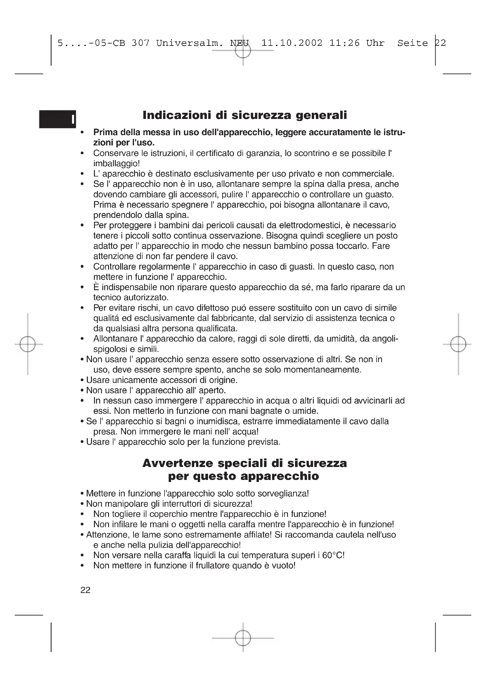 5....-05-CB 307 Universalm. NEU 11.10.2002 11:26 Uhr Seite 23menti di comando". Prima di ogni uso il blocco lame deve essere avvitato bene e stabilmente alla caraffa. Pulire l'esterno della base del frullatore con un panno umido. Avvertenza importante per l'interruttore di sicurezza Il frullatore universale è dotato di un interruttore di sicurezza che deve impedire che il motore si avvii senza caraffa (pericolo di ferirsi!) Inserendo la caraffa il perno di sicurezza sul coperchio trasparente preme l'interrut- tore di sicurezza della scatola del motore. Ora si può accendere il frullatore univer- sale. Se il perno di sicurezza non preme correttamente l'interruttore di sicurezza, il motore non si avvia. Ciò può verificarsi se è stata modificata la posizione dell'anello trasparente di copertura, per esempio durante la pulizia. Fare attenzione che il perno di sicurezza si trovi nella posizione giusta. Per i destrorsi il perno dovrebbe trovarsi sotto l'impugnatura. Per i mancini sotto il beccuccio. Questo apparecchio corrisponde alle norme CE per i disturbi radio e la sicurezza contro le correnti a basso voltaggio ed è stato costruito in base alle più recenti norme tecniche di sicurezza. Con riserva di apportare modifiche tecniche. Garanzia A partire dalla data di acquisto, questo prodotto è garantito dal produttore per un periodo di 24 mesi (scontrino). Durante la durata della garanzia, il produttore eliminerà gratuitamente difetti dell'- apparecchio dovuti a imperfezioni di produzione o di materiale, eventualmente cam- biando l' unità oppure procedendo con le dovute riparazioni. La garanzia è valida solo con lo scontrino. Senza l' esibizione dello scontrino non è possibile fare svolgere le riparazioni gratuitamente. In caso di riparazioni con garanzia, è necessario ritornare al produttore l' appa- recchio intero, nell'imballaggio originale, accompagnato dallo scontrino. In caso di rottura di vetro e difetti agli accessori, i pezzi necessari verranno spediti in cambio gratuitamente. In questo caso è necessario di non spedire l' intero appa- recchio, ma ordinare solo l' accessorio difettoso! Pulizia, manutenzione e scambio non fanno parte della garanzia e sono perciò sono soggetti a spese. La garanzia perde la sua validità se l'apparecchio è sottomesso all' intervento di terzi.
