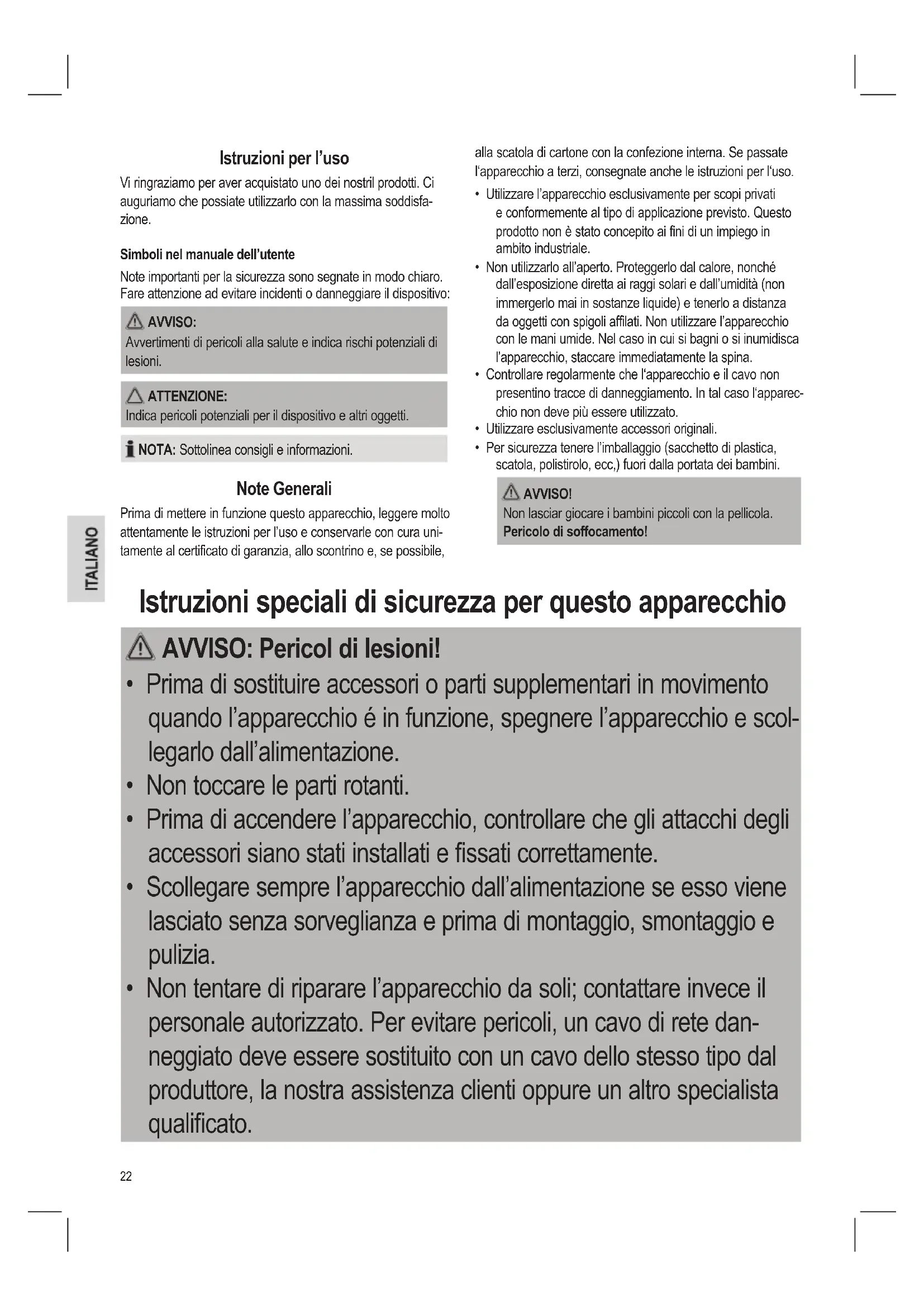 - Per sicurezza tenere l’imballaggio (sacchetto di plastica, scatola, polistirolo, ecc,) fuori dalla portata dei bambini. AVVISO! Non lasciar giocare i bambini piccoli con la pellicola. Pericolo di soffocamento! Istruzioni speciali di sicurezza per questo apparecchio AVVISO: Pericol di lesioni!