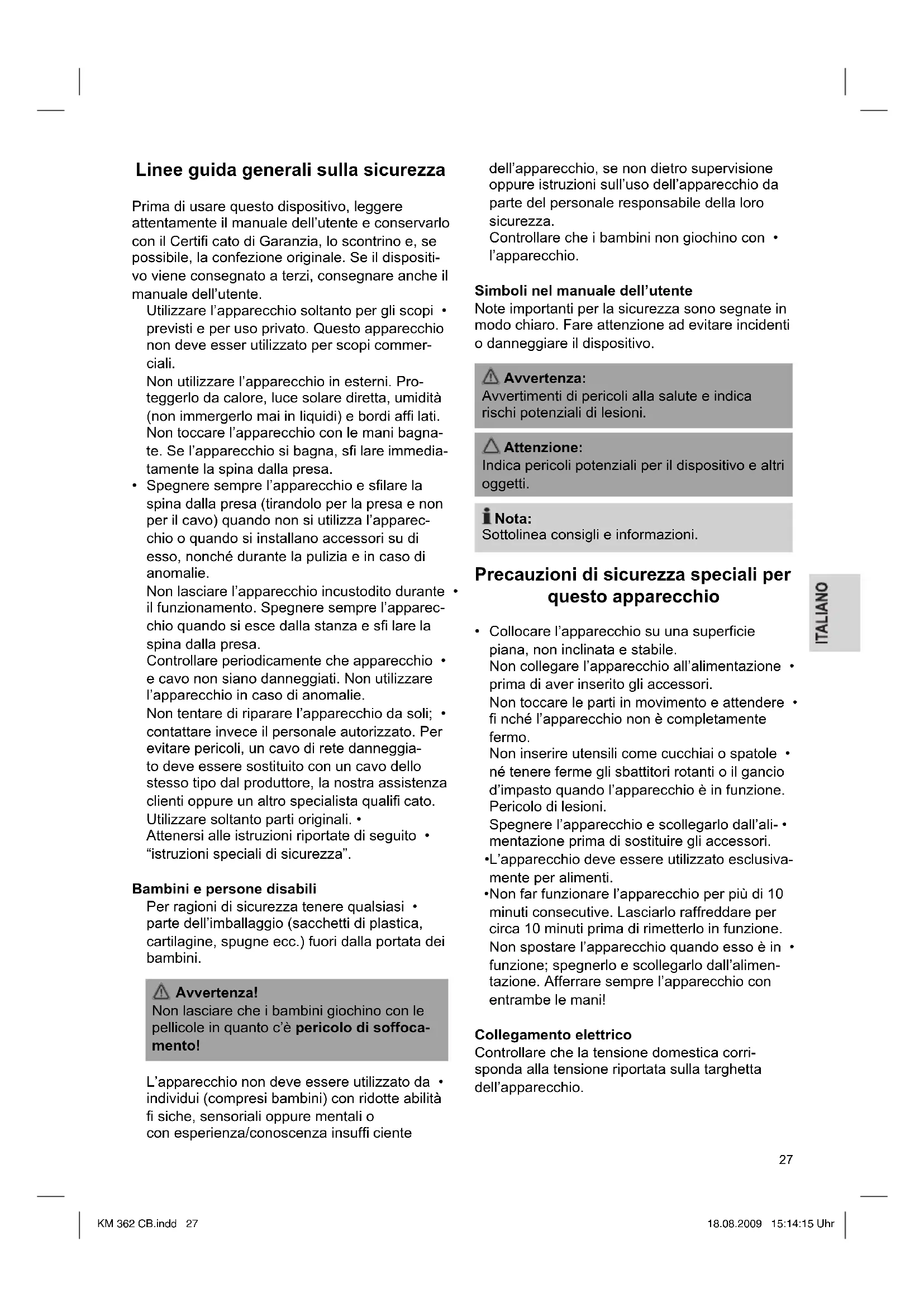 sezione “Pulizia”. Ricette consigliate Impasto al cucchiaio (Ricetta base) Impostazione velocità 2 - 3 Ingredienti: 250 g di burro morbido a margarina, 250 g di zucchero, 1 bustina di zucchero vanigliato o 1 bustina di aroma di limone, 1 presa di sale, 4 uova, 500 g di farina, 1 bustina di lievito, circa 1/8 l di latte. Preparazione: Mettere la farina con gli altri ingredienti nella ciotola mixer, mescolare con il gancio mixer per 30 secondi a velocità 2, quindi circa 3 minuti a velocità 3. Imburrare lo stampo o coprirne la base con carta da forno, depositarvi l’impasto e infornarlo. Prima di estrarre l’impasto dal forno, controllare se è pronto infi lando uno stuzzicaden- ti di legno al centro. Se l’impasto non si attacca la torta è pronta. Girare l’impasto su una griglia e lasciarlo raffreddare. Forno convenzionale: Velocità: 2 Calore: Forno elettrico: calore sopra e sotto 175-200°, forno a gas: impostazione 2-3 Durata: 50-60 minuti È possibile modifi care la ricotta a seconda del gusto, cioè con 100 g di uvetta o 100 g di noci o 100 g di cioccolata grattugiata. Non ci sono limiti all’immaginazione. Involtini ai semi di lino Impostazione velocità 1 - 2 Ingredienti: 500-550 g di farina, 50 g di semi di lino, 3/8 l d’acqua, 1 cubetto di lievito (40 g), 100 g di cagliata magra ben spurgata, 1 cucchiaino da te di sale. Per la rifi nitura: 2 cucchiai d’acqua. Preparazione: Ammollare i semi di lino in 1/8 l di acqua tiepida. Mettere la rimanente acqua tiepida (1/4 di l) nella ciotola mixer, aggiungere il lievito, la cagliata e mescolare bene con il gancio impasto con impostazione velocità 1. Il lievito deve sciogliersi completamente, Mettere la farina con i semi di lino ammollati e il sale nella ciotola mixer. Impa- stare a velocità 1, quindi passare a velocità 2 e KM 362 CB.indd 29KM 362 CB.indd 29 18.08.2009 15:14:16 Uhr18.08.2009 15:14:16 Uhr un30 impastare per altri 3-5 minuti. Coprire l’impasto e lasciarlo riposare in un luogo caldo per 45-60 minuti. Impastare nuovamente, estrarre dalla ciotola mixer e ritagliare 16 involtini di pane. Coprire il vassoio con carta da dolci. Collocarvi sopra gli involtini, lasciarli riposare per 15 minuti, pennellarli con acqua tiepida e informare. Forno convenzionale: Velocità: 2 Calore: Forno elettrico: calore sopra e sotto 200-220° (Preriscaldato per 5 minuti), Forno a gas: impostazione 2-3 Durata: 30-40 minuti Pulizia Avvertenza: Scollegare dall’alimentazione prima di ► effettuare la pulizia. Non immergere l’apparecchio in acqua per ► non provocare scosse elettriche o incendi. Attenzione: Non utilizzare spazzole d’acciaio o altri ► utensili abrasive per effettuare la pulizia. Non utilizzare detergenti aggressive o ► abrasivi. Pulire l’alloggiamento con un panno umido. • Lavare tutti gli accessori amovibili in lavasto- • viglie. Attenzione: Gli attacchi non devono essere lavati in lavastoviglie. Calore e detergenti aggressive possono deformare o scolorire gli attacchi. Conservazione Si consiglia di coprire l’albero guida se l’appa- recchio viene messo via senza la ciotola mixer: Tenere il coperchio protettivo (9) sull’albero guida in modo che la freccia bianca ▲ si trovi sotto il puntino bianco ●. Girare il coperchio protettivo in senso orario fi no al fi ne-corsa. Le due fecce bianche ▼ e ▲ devono trovarsi una opposta all’altra. Emissioni acustiche Il livello di pressione acustica è stato misurato all’orecchio di un utente (LpA) secondo la norma DIN EN ISO 3744. Livello di pressione acustica determinato: 75 - 85 dB(A) (senza limiti) Specifi che tecniche Modello: ..............................................KM 362 CB Tensione/frequenza nominale: ........ 230 V/ 50 Hz Consumo energetico: ...............................1000 W Classe di protezione: .........................................II Funzionamento a breve termine: ........... 10 minuti Peso netto: ............................................... 5,65 kg Soggetto a modifi che senza preavviso! Questo dispositivo risponde a tutte le direttive della CE, come la direttiva sulla compatibilità elettromagnetica e quella sul basso voltaggio ed è prodotto secondo le più recenti norme di sicurezza. Signifi cato del simbolo “Cassonetto con ruote“ Rispettare l'ambiente, non smaltire dispositivi elettrici nei rifi uti domestici. Lo smaltimento di dispositivi obsoleti o difettosi deve avvenire tramite consegna presso punti di raccolta locali. Aiutate ad evitare pericoli potenziali per l'ambien- te e la nostra salute tramite uno smaltimento non corretto. Voi contribuite al riciclaggio e altro forme di utiliz- zo di dispositivi elettrici e elettronici. Il vostro comune è in grado di fornirvi informazio- ni sui punti di raccolta. KM 362 CB.indd 30KM 362 CB.indd 30 18.08.2009 15:14:16 Uhr18.08.2009 15:14:16 Uhr31 Загальні вказівки щодо техніки