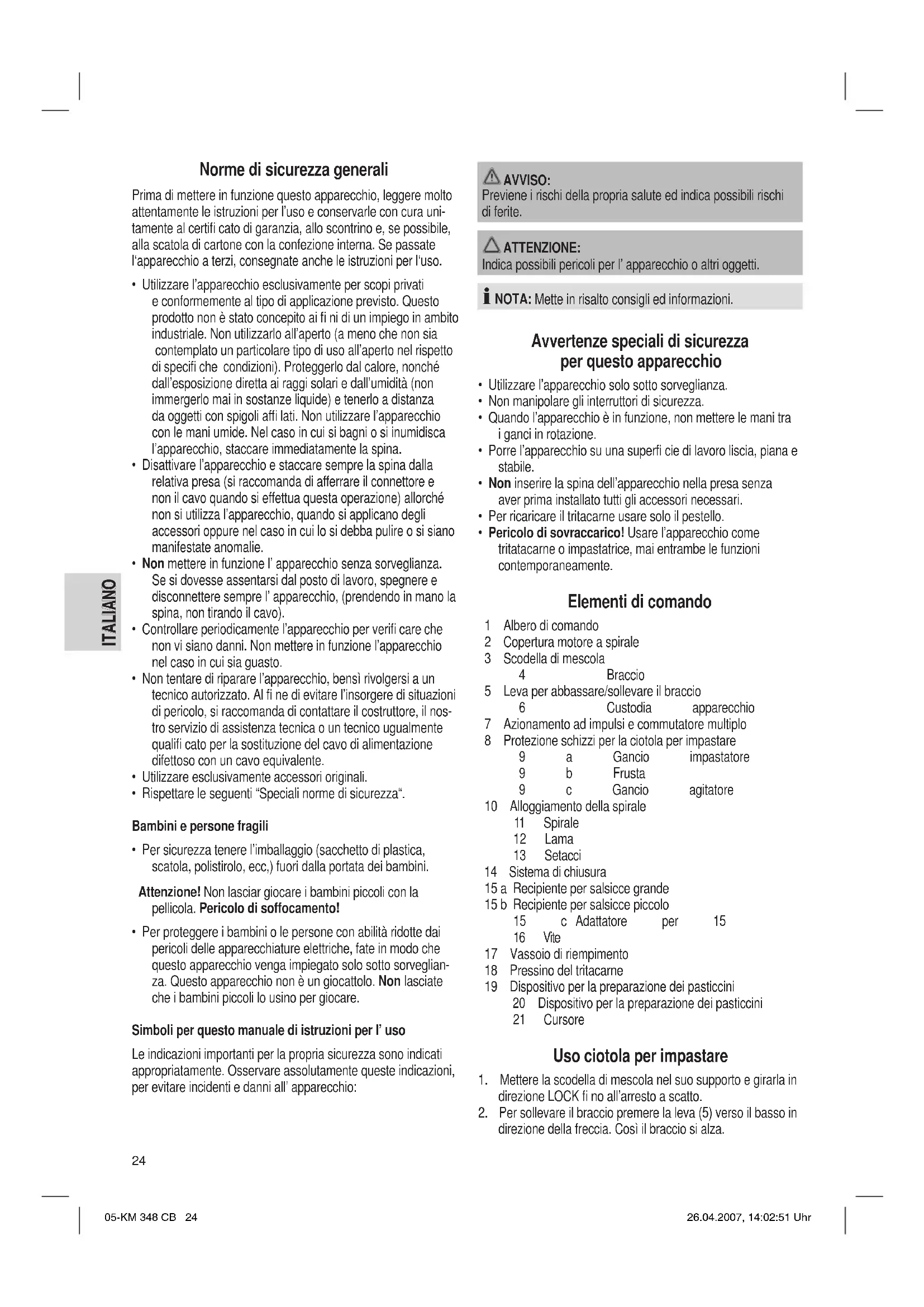- Pericolo di sovraccarico! Usare l’apparecchio come tritatacarne o impastatrice, mai entrambe le funzioni contemporaneamente. Elementi di comando 1 Albero di comando 2 Copertura motore a spirale 3 Scodella di mescola 4 Braccio 5 Leva per abbassare/sollevare il braccio 6 Custodia apparecchio 7 Azionamento ad impulsi e commutatore multiplo 8 Protezione schizzi per la ciotola per impastare 9 a Gancio impastatore 9 b Frusta 9 c Gancio agitatore 10 Alloggiamento della spirale 11 Spirale 12 Lama 13 Setacci 14 Sistema di chiusura 15 a Recipiente per salsicce grande 15 b Recipiente per salsicce piccolo 15 c Adattatore per 15 16 Vite 17 Vassoio di riempimento 18 Pressino del tritacarne 19 Dispositivo per la preparazione dei pasticcini 20 Dispositivo per la preparazione dei pasticcini 21 Cursore Uso ciotola per impastare