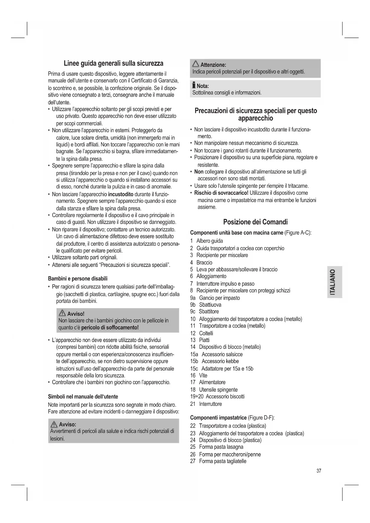- Rischio di sovraccarico! Utilizzare il dispositivo come macina carne o impastatrice ma mai entrambe le funzioni assieme. Posizione dei Comandi Componenti unità base con macina carne (Figure A-C): 1 Albero guida 2 Guida trasportatori a coclea con coperchio 3 Recipiente per miscelare 4 Braccio 5 Leva per abbassare/sollevare il braccio 6 Alloggiamento 7 Interruttore impulso e passo 8 Recipiente per miscelare con proteggi schizzi 9a Gancio per impasto 9b Sbattiuova 9c Sbattitore 10 Alloggiamento del trasportatore a coclea (metallo) 11 Trasportatore a coclea (metallo) 12 Coltelli 13 Piatti 14 Dispositivo di blocco (metallo) 15a Accessorio salsicce 15b Accessorio kebbe 15c Adattatore per 15a e 15b 16 Vite 17 Alimentatore 18 Utensile spingente 19+20 Accessorio biscotti 21 Interruttore Componenti impastatrice (Figure D-F): 22 Trasportatore a coclea (plastica) 23 Alloggiamento del trasportatore a coclea (plastica) 24 Dispositivo di blocco (plastica) 25 Forma pasta lasagna 26 Forma per maccheroni/penne 27 Forma pasta tagliatelle38 28 Forma pasta spaghetti larghi 29 Forma pasta spaghetti sottili Componenti miscelatore (Figura G): 30 Coperchio contenitore per miscelare con foro per riempire 31 Coperchio foro per riempire 32 Contenitore per miscelare 33 Meccanismo di bloccaggio con set di coltelli Nella confezione 1 X Impastatrice/miscelatore 1 X Recipiente per miscelare 1 X Proteggi schizzi con alimentatore 1 X Gancio impastatrice 1 X Sbattiuova 1 X Frusta 1 X Alloggiamento del trasportatore a coclea 1 X Trasportatore a coclea 1 X Coltello 3 X Piatti 1 X Dispositivo di blocco 1 X Accessorio salsicce 1 X Accessorio kebbe 1 X Adattatore per accessorio salsicce/ kebbe 1 X Vite 1 X Alimentatore 1 X Utensile spingente 1 X Accessorio biscotti 3 pezzi 1 X Trasportatore a coclea (plastica) 1 X Alloggiamento del trasportatore a coclea (plastica) 1 X Dispositivo di blocco (plastica) 1 X Forma pasta lasagna 1 X Forma per maccheroni/penne 1 X Forma pasta tagliatelle 1 X Forma pasta spaghetti larghi 1 X Forma pasta spaghetti sottili 1 X Coperchio foro per riempire 1 X Coperchio contenitore per miscelare con foro per riempire 1 X Contenitore per miscelare Nessuna illustrazione 1 X Scatola per conservare 1 X Utensile per meccanismo di blocco impastatrice Istruzioni d'uso recipiente per miscelare