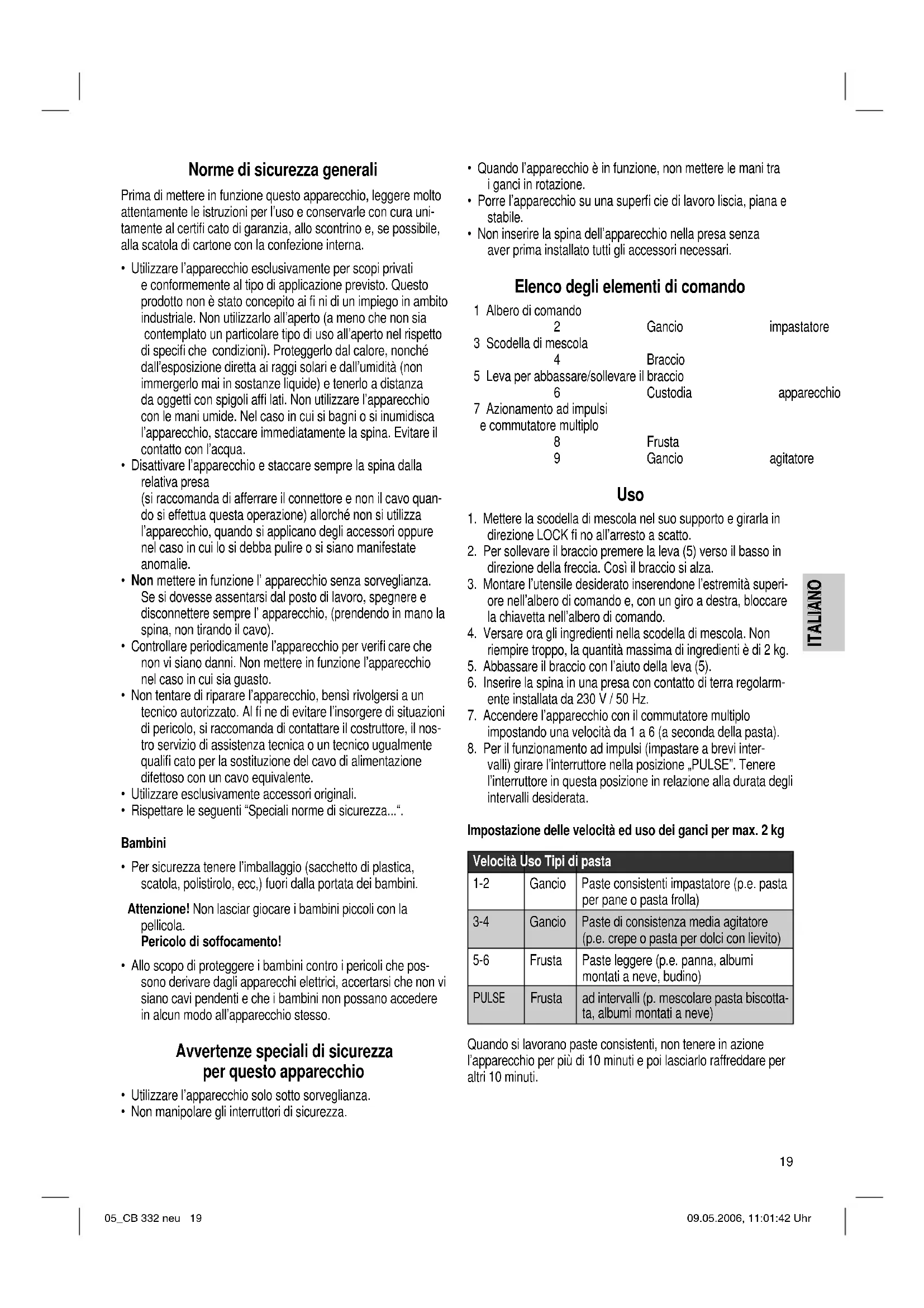 valli) girare l’interruttore nella posizione „PULSE”. Tenere l’interruttore in questa posizione in relazione alla durata degli intervalli desiderata. Impostazione delle velocità ed uso dei ganci per max. 2 kg Velocità Uso Tipi di pasta 1-2 Gancio Paste consistenti impastatore (p.e. pasta per pane o pasta frolla) 3-4 Gancio Paste di consistenza media agitatore (p.e. crepe o pasta per dolci con lievito) 5-6 Frusta Paste leggere (p.e. panna, albumi montati a neve, budino) PULSE Frustaad intervalli (p. mescolare pasta biscotta- ta, albumi montati a neve) Quando si lavorano paste consistenti, non tenere in azione l’apparecchio per più di 10 minuti e poi lasciarlo raffreddare per altri 10 minuti. 05_CB 332 neu 19 09.05.2006, 11:01:42 Uhr20 ITALIANO ITALIANO