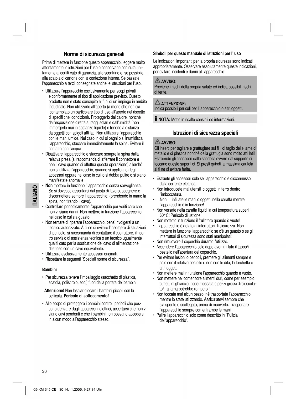 max. :.............................................................................. 550 W Classe di protezione:................................................................... ΙΙ Funzionamento raccorciato:.................................................2 min. Questo apparecchio è stato controllato sulla base di tutte le direttive CE attuali in vigore in questo settore, quali per esempio la normativa in materia di compatibilità elettromagnetica e la direttiva in materia di bassa tensione, ed è stato costruito conformemente alle norme di sicurezza più moderne. Con riserva di apportare modifi che tecniche. Garanzia Per l’apparecchio da noi messo in commercio ci assumiamo una garanzia di 24 mesi dalla data di acquisto (scontrino). Durante la garanzia noi ci impegniamo ad eliminare gratuita- mente i guasti dell’apparecchio o degli accessori, dovuti a difetti di materiale o di fabbricazione, riparandoli o, a nostra discrezio- ne, sostituendoli. Le prestazioni in garanzia danno luogo a una proroga della garanzia né danno diritto ad una nuova garanzia! Per la garanzia è suffi ciente lo scontrino di acquisto. Senza questo scontrino non sussiste il diritto né ad una sostituzione né ad una riparazione gratuita. Nel caso si ricorra alla garanzia, restituire al rivenditore l’apparecchio completo in ogni sua parte, nell’imballaggio originale unitamente allo scontrino. La riparazione di pezzi d’uso ovvero soggetti a logoramento come anche operazioni di pulizia e manutenzione o la sostituzio- ne di pezzi soggetti a logoramento non rientrano nella garanzia e quindi sono a pagamento! La garanzia si annulla nel caso di intervento da parte di terzi. Dopo la garanzia Al termine della garanzia le riparazioni possono essere eseguite dietro pagamento dal corrispettivo negozio specializzato o servizio riparazioni. Signifi cato del simbolo „Eliminazione“ Salvaguardare l’ ambiente, gli elettrodomestici non vanno eliminati come rifi uti domestici. Per l’ eliminazione degli elettrodomestici, fare uso die posti di raccolta previsti per questo tipo e porre quegli elettrodomestici che non sono più in uso. Si contribuisce così ad evitare un effetto potenziale sull’ ambien- te e sulla salute, dovuto magari ad una eliminazione sbagliata. Questo signifi ca un contributo personale alla riutilizzazione, al riciclaggio e altre forme di utilizzazione di elettrodomestici ed apparecchi elettronici usati. Si possono trovare le corrispondenti informazioni sugli appositi luoghi di raccolta, nelle amministrazioni die comuni. 05-KM 345 CB 34 14.11.2006, 9:27:43 UhrITALIANO
