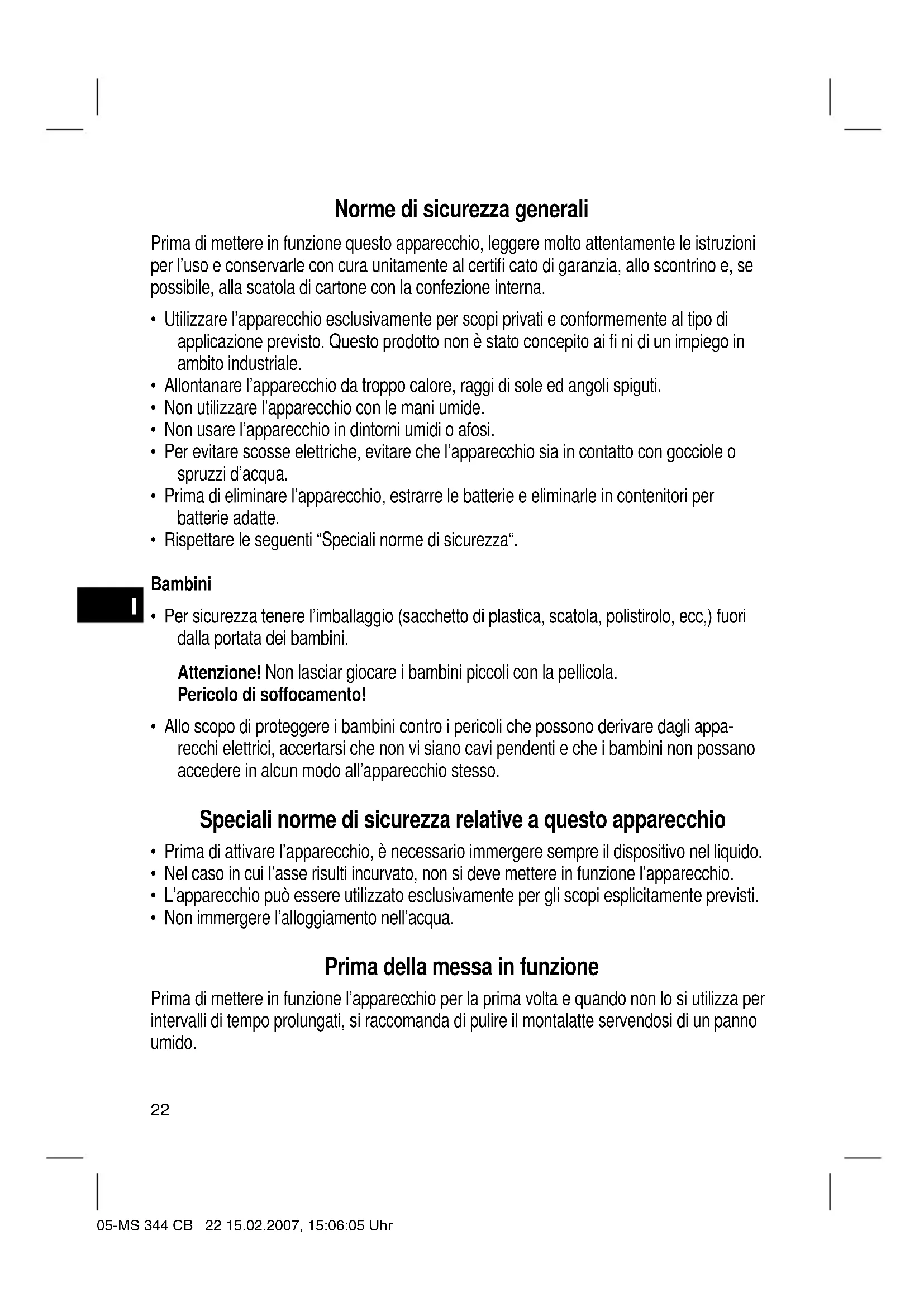 - Non immergere l’alloggiamento nell’acqua. Prima della messa in funzione Prima di mettere in funzione l’apparecchio per la prima volta e quando non lo si utilizza per intervalli di tempo prolungati, si raccomanda di pulire il montalatte servendosi di un panno umido. 05-MS 344 CB 22 15.02.2007, 15:06:05 UhrI