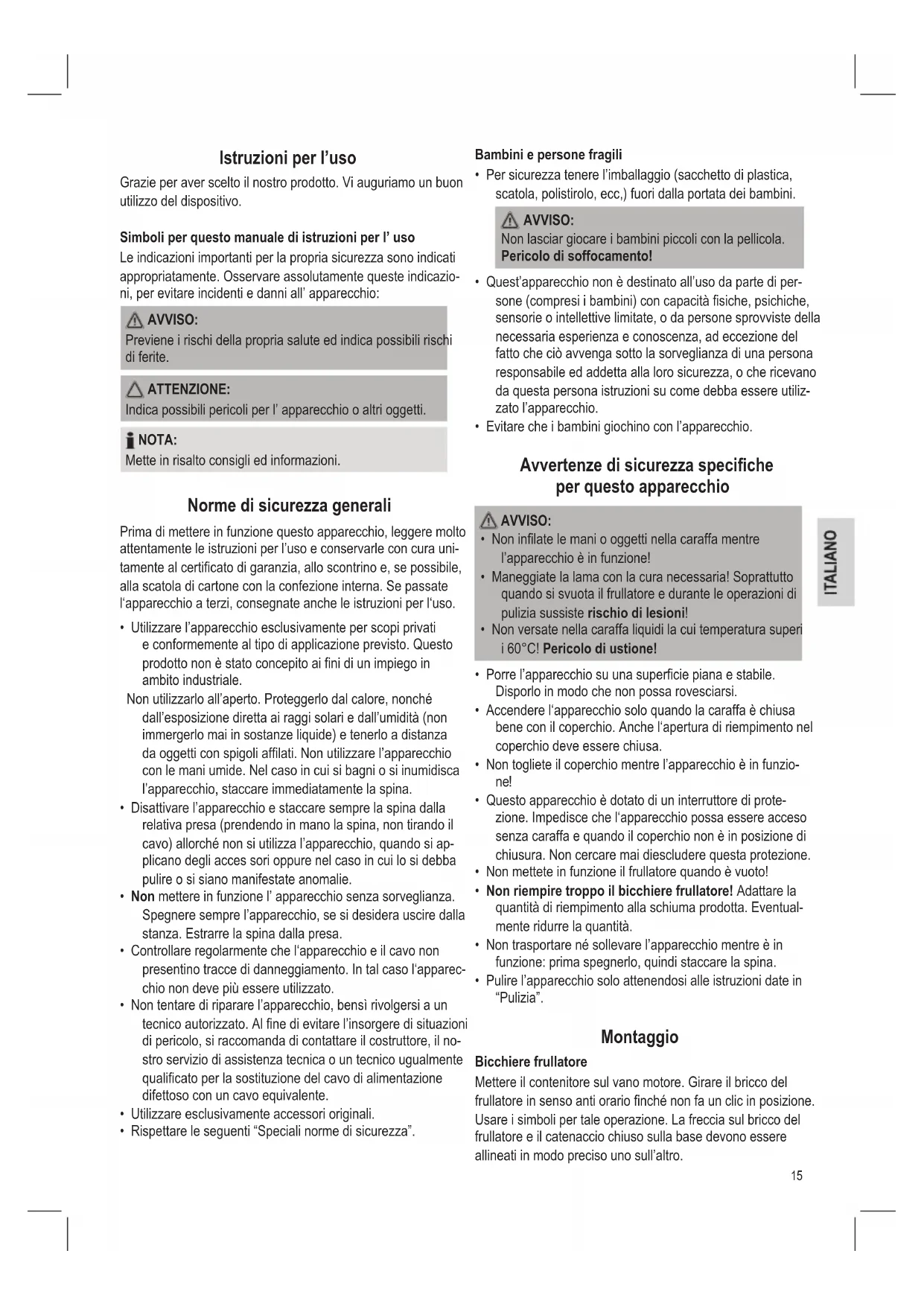 - Maneggiate la lama con la cura necessaria! Soprattutto quando si svuota il frullatore e durante le operazioni di pulizia sussiste rischio di lesioni!