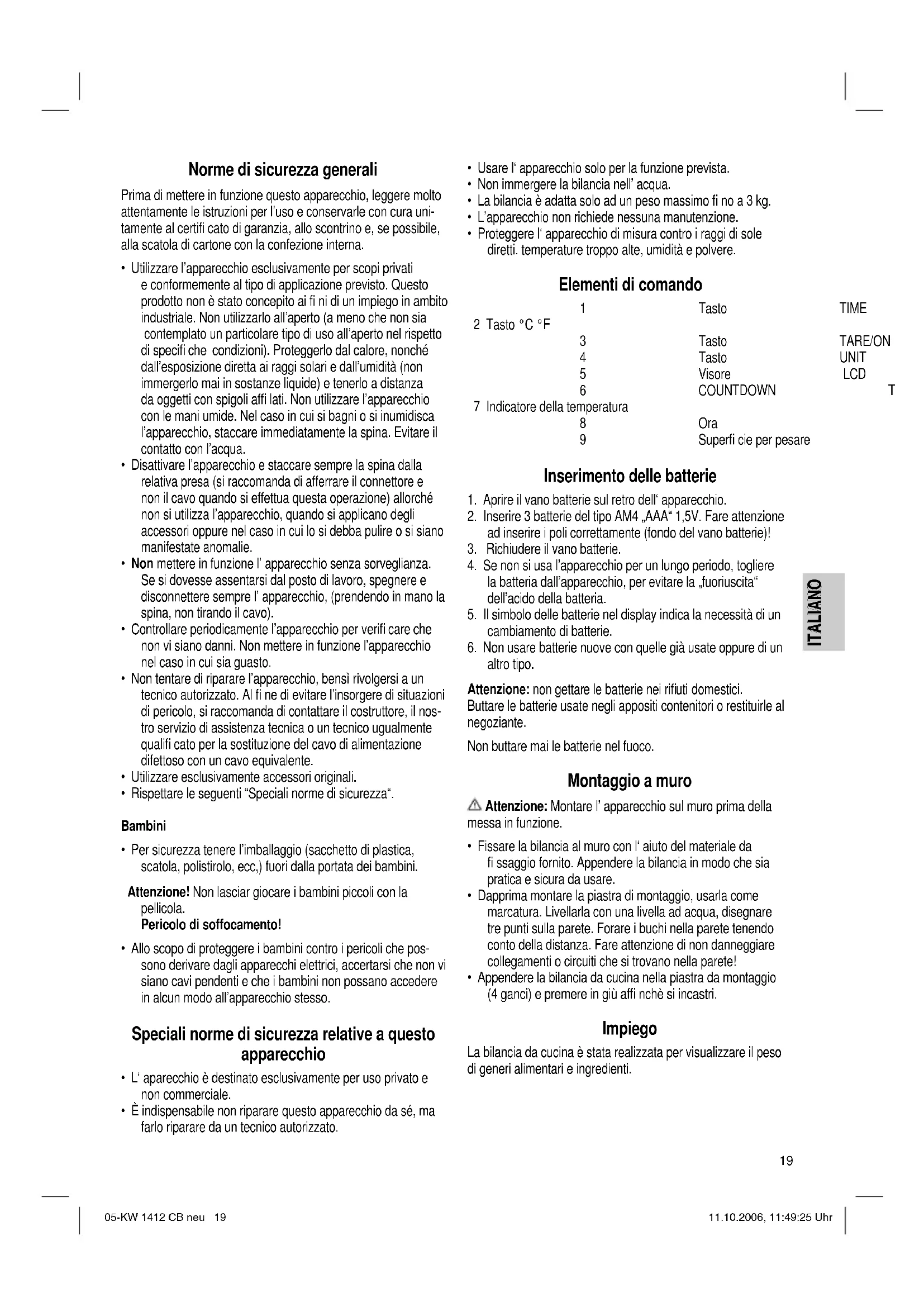 - Appendere la bilancia da cucina nella piastra da montaggio (4 ganci) e premere in giù affi nchè si incastri. Impiego La bilancia da cucina è stata realizzata per visualizzare il peso di generi alimentari e ingredienti. 05-KW 1412 CB neu 19 11.10.2006, 11:49:25 Uhr20 ITALIANO ITALIANO Impostazione dell‘ ora (12 h)