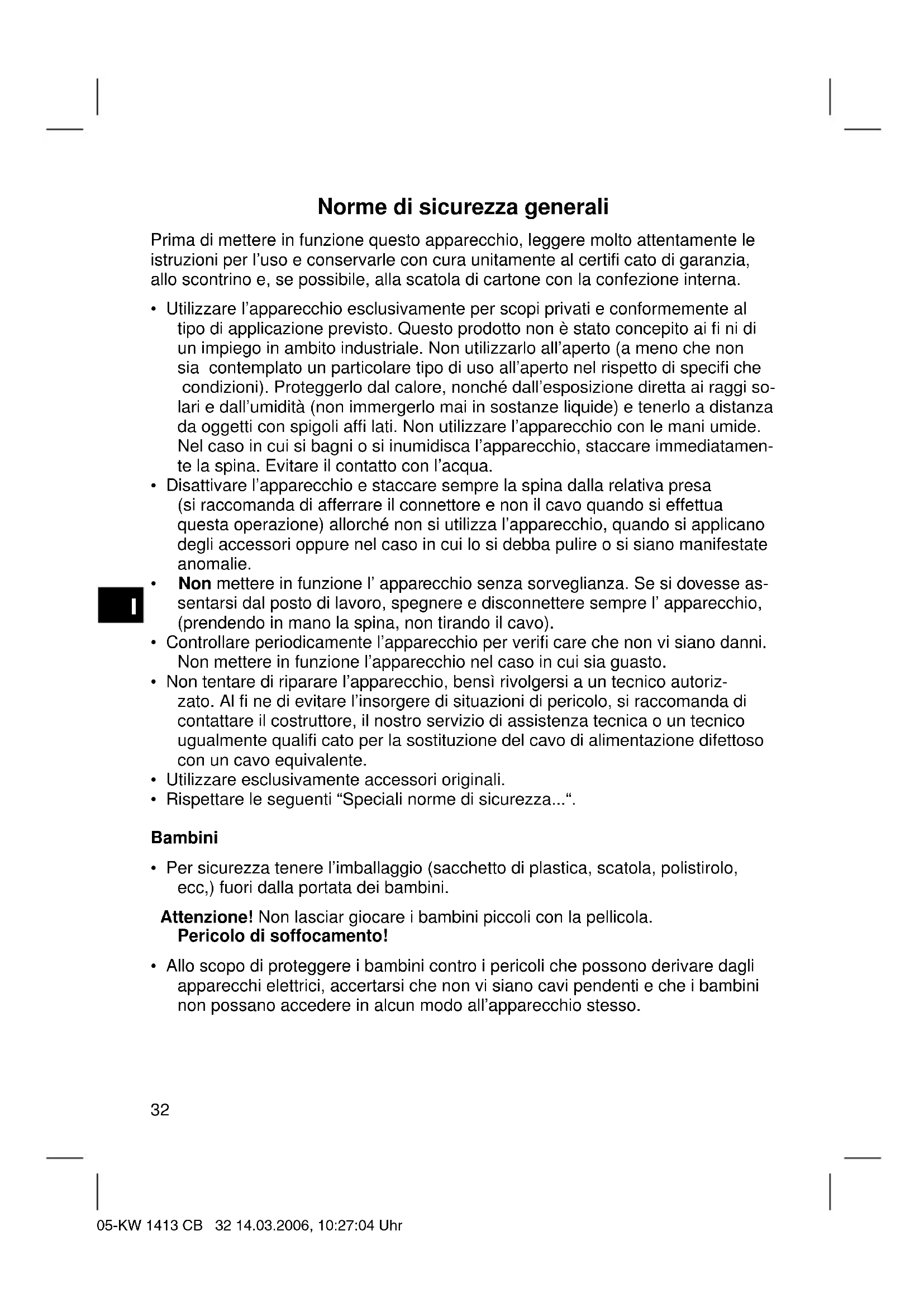 - Allo scopo di proteggere i bambini contro i pericoli che possono derivare dagli apparecchi elettrici, accertarsi che non vi siano cavi pendenti e che i bambini non possano accedere in alcun modo all’apparecchio stesso. 05-KW 1413 CB 32 14.03.2006, 10:27:04 UhrI