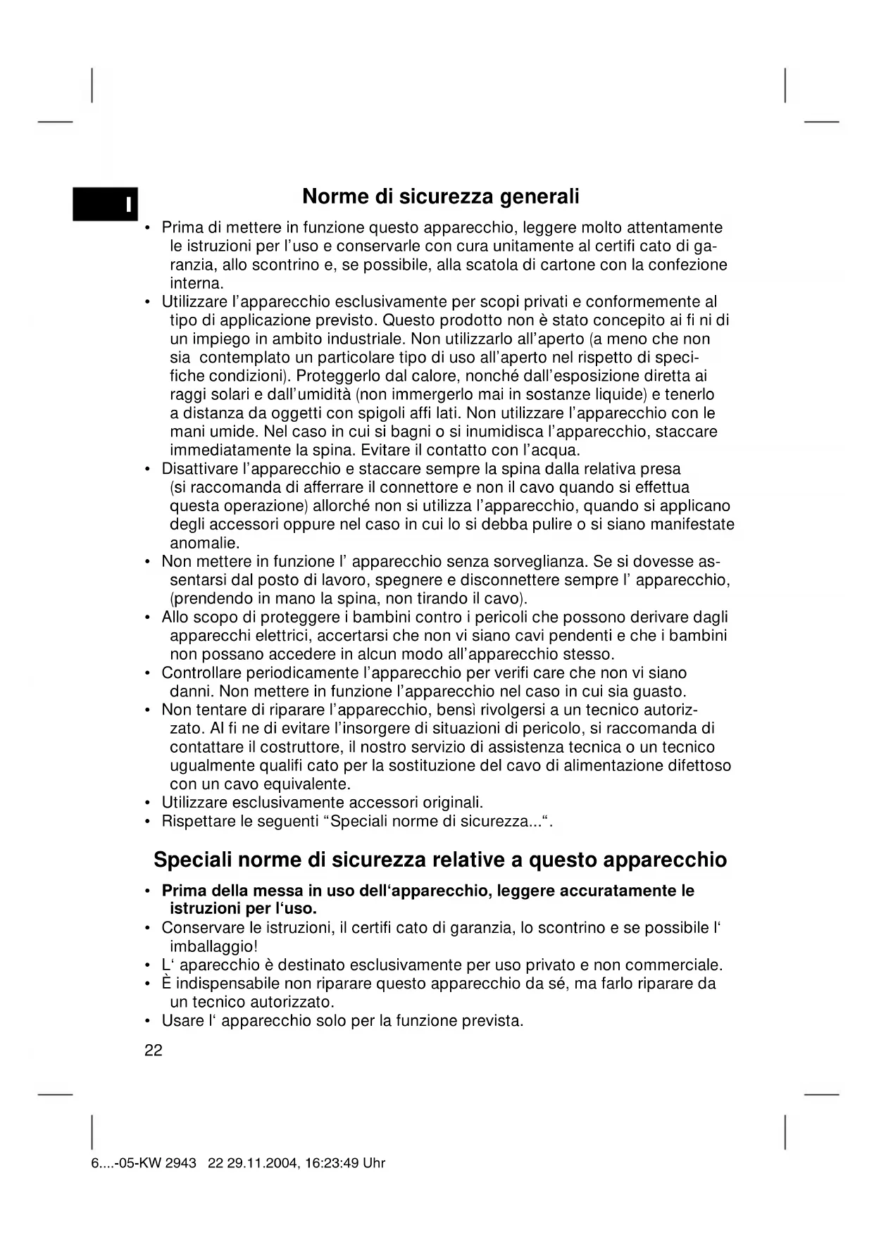 *) Danni agli accessori non giustifi cano automaticamente lo scambio gratuito dell’apparecchio completo. Si prega di mettersi in contatto con la nostra centrale telefonica. Danni alle parti di vetro oppure fratture ai pezzi di materia plastica sono obbligatoriamente a spese del cliente. La riparazione di pezzi d’uso ovvero soggetti a logoramento (cursori, ganci im- pastatori, cinghie di trasmissione, telecomandi di ricambio, spazzolini di ricambio, lame di seghe ecc.) come anche operazioni di pulizia e manutenzione o la sostitu- zione di pezzi soggetti a logoramento non rientrano nella garanzia e quindi sono a pagamento! La garanzia si annulla nel caso di intervento da parte di terzi. Dopo la garanzia Al termine della garanzia le riparazioni possono essere eseguite dietro pagamento dal corrispettivo negozio specializzato o servizio riparazioni. 6....-05-KW 2943 25 29.11.2004, 16:23:50 UhrN