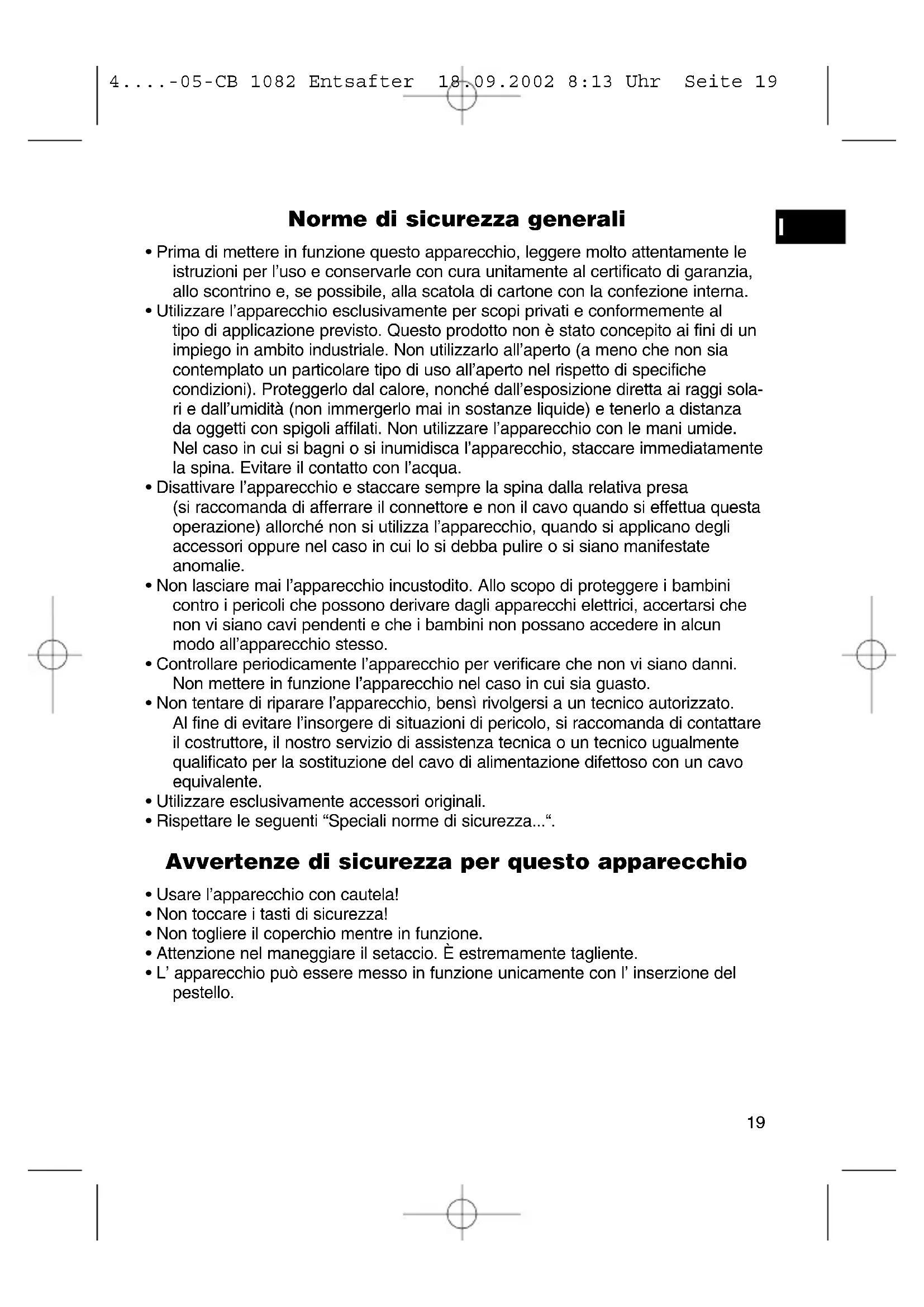 4....-05-CB 1082 Entsafter 18.09.2002 8:13 Uhr Seite 20Garanzia Per l’apparecchio da noi messo in commercio ci assumiamo una garanzia di 24 mesi dalla data di acquisto (scontrino). Durante la garanzia noi ci impegniamo ad eliminare gratuitamente i guasti dell’ap- parecchio o degli accessori*), dovuti a difetti di materiale o di fabbricazione, riparan- doli o, a nostra discrezione, sostituendoli. Le prestazioni in garanzia danno luogo a una proroga della garanzia né danno diritto ad una nuova garanzia! Per la garanzia è sufficiente lo scontrino di acquisto. Senza questo scontrino non sussiste il diritto né ad una sostituzione né ad una riparazione gratuita. Nel caso si ricorra alla garanzia, restituire al rivenditore l’apparecchio completo in ogni sua parte, nell’imballaggio originale unitamente allo scontrino. *) Danni agli accessori non giustificano automaticamente lo scambio gratuito dell’- apparecchio completo. Si prega di mettersi in contatto con la nostra centrale telefo- nica. Danni alle parti di vetro oppure fratture ai pezzi di materia plastica sono obbli- gatoriamente a spese del cliente. La riparazione di pezzi d’uso ovvero soggetti a logoramento (cursori, ganci impa- statori, cinghie di trasmissione, telecomandi di ricambio, spazzolini di ricambio, lame di seghe ecc.) come anche operazioni di pulizia e manutenzione o la sostitu- zione di pezzi soggetti a logoramento non rientrano nella garanzia e quindi sono a pagamento! La garanzia si annulla nel caso di intervento da parte di terzi. Dopo la garanzia Al termine della garanzia le riparazioni possono essere eseguite dietro pagamento dal corrispettivo negozio specializzato o servizio riparazioni.