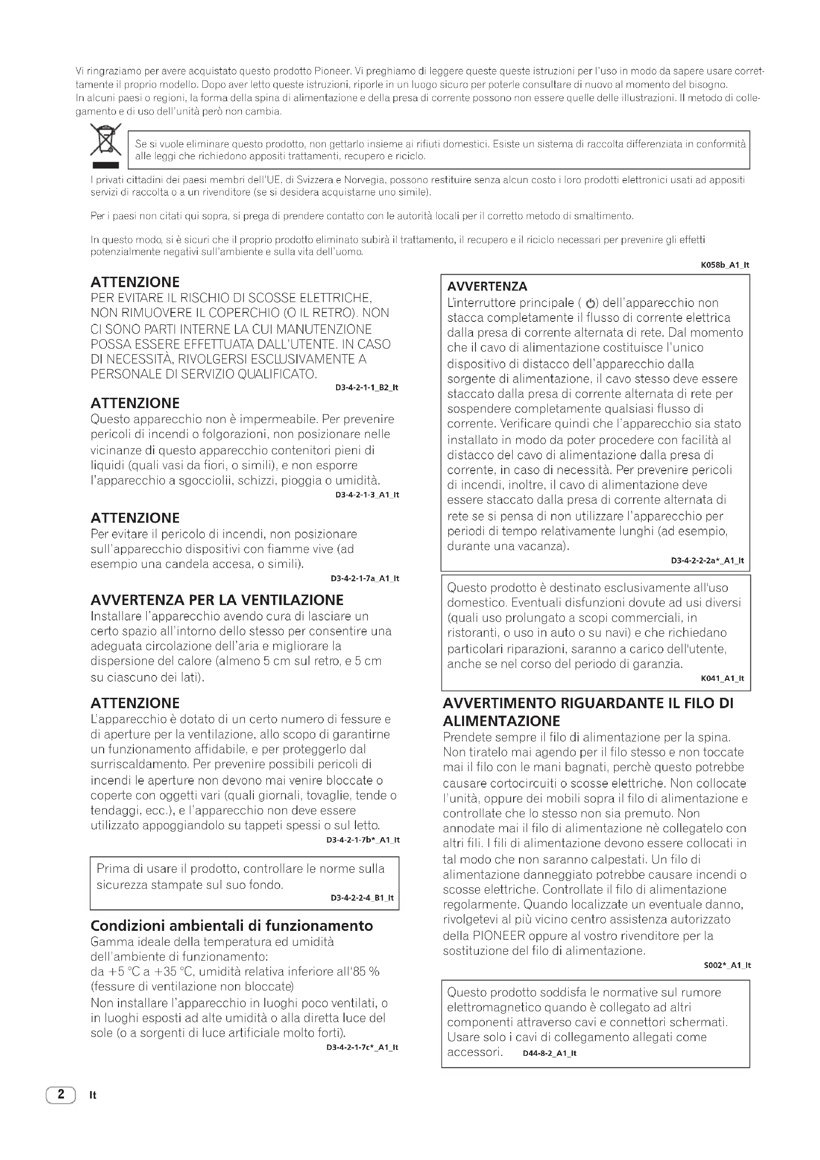 ALIMENTAZIONE Prendete sempre il filo di alimentazione per la spina. Non tiratelo mai agendo per il filo stesso e non toccate mai il filo con le mani bagnati, perchè questo potrebbe causare cortocircuiti o scosse elettriche. Non collocate l’unità, oppure dei mobili sopra il filo di alimentazione e controllate che lo stesso non sia premuto. Non annodate mai il filo di alimentazione nè collegatelo con altri fili. I fili di alimentazione devono essere collocati in tal modo che non saranno calpestati. Un filo di alimentazione danneggiato potrebbe causare incendi o scosse elettriche. Controllate il filo di alimentazione regolarmente. Quando localizzate un eventuale danno, rivolgetevi al più vicino centro assistenza autorizzato della PIONEER oppure al vostro rivenditore per la sostituzione del filo di alimentazione. S002*_A1_ItIt