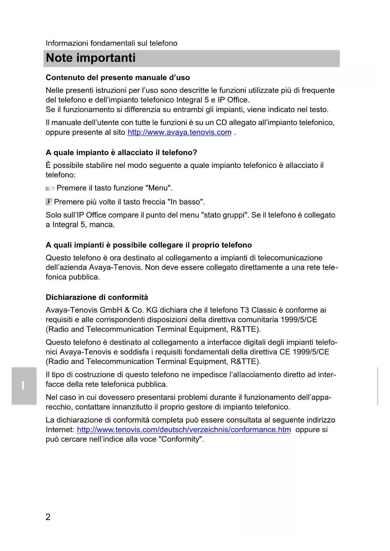 Questo telefono è destinato al collegamento a interfacce digitali degli impianti telefonici Avaya-Tenovis e soddisfa i requisiti fondamentali della direttiva CE 1999/5/CE (Radio and Telecommunication Terminal Equipment, R&TTE).