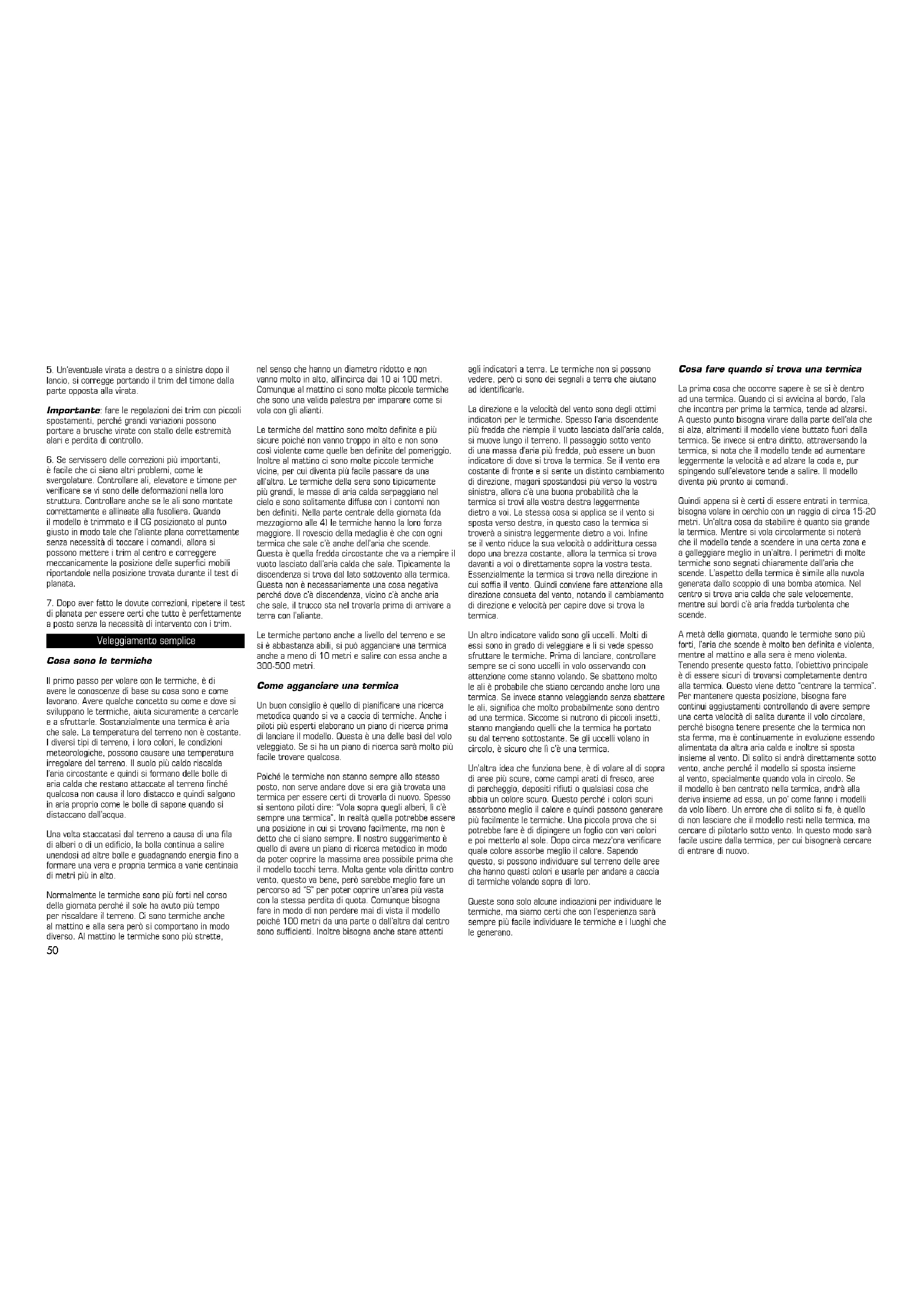 di planata per essere certi che tutto è perfettamente a posto senza la necessità di intervento con i trim. Veleggiamento semplice Cosa sono le termiche Il primo passo per volare con le termiche, è di avere le conoscenze di base su cosa sono e come lavorano. Avere qualche concetto su come e dove si sviluppano le termiche, aiuta sicuramente a cercarle e a sfruttarle. Sostanzialmente una termica è aria che sale. La temperatura del terreno non è costante. I diversi tipi di terreno, i loro colori, le condizioni meteorologiche, possono causare una temperatura irregolare del terreno. Il suolo più caldo riscalda l’aria circostante e quindi si formano delle bolle di aria calda che restano attaccate al terreno finché qualcosa non causa il loro distacco e quindi salgono in aria proprio come le bolle di sapone quando si distaccano dall’acqua. Una volta staccatasi dal terreno a causa di una fila di alberi o di un edificio, la bolla continua a salire unendosi ad altre bolle e guadagnando energia fino a formare una vera e propria termica a varie centinaia di metri più in alto. Normalmente le termiche sono più forti nel corso della giornata perché il sole ha avuto più tempo per riscaldare il terreno. Ci sono termiche anche al mattino e alla sera però si comportano in modo diverso. Al mattino le termiche sono più strette, nel senso che hanno un diametro ridotto e non vanno molto in alto, all’incirca dai 10 ai 100 metri. Comunque al mattino ci sono molte piccole termiche che sono una valida palestra per imparare come si vola con gli alianti. Le termiche del mattino sono molto definite e più sicure poiché non vanno troppo in alto e non sono così violente come quelle ben definite del pomeriggio. Inoltre al mattino ci sono molte piccole termiche vicine, per cui diventa più facile passare da una all’altra. Le termiche della sera sono tipicamente più grandi, le masse di aria calda serpeggiano nel cielo e sono solitamente diffuse con i contorni non ben definiti. Nella parte centrale della giornata (da mezzogiorno alle 4) le termiche hanno la loro forza maggiore. Il rovescio della medaglia è che con ogni termica che sale c’è anche dell’aria che scende. Questa è quella fredda circostante che va a riempire il vuoto lasciato dall’aria calda che sale. Tipicamente la discendenza si trova dal lato sottovento alla termica. Questa non è necessariamente una cosa negativa perché dove c’è discendenza, vicino c’è anche aria che sale, il trucco sta nel trovarla prima di arrivare a terra con l’aliante. Le termiche partono anche a livello del terreno e se si è abbastanza abili, si può agganciare una termica anche a meno di 10 metri e salire con essa anche a 300-500 metri. Come agganciare una termica Un buon consiglio è quello di pianificare una ricerca metodica quando si va a caccia di termiche. Anche i piloti più esperti elaborano un piano di ricerca prima di lanciare il modello. Questa è una delle basi del volo veleggiato. Se si ha un piano di ricerca sarà molto più facile trovare qualcosa. Poiché le termiche non stanno sempre allo stesso posto, non serve andare dove si era già trovata una termica per essere certi di trovarla di nuovo. Spesso si sentono piloti dire: “Vola sopra quegli alberi, lì c’è sempre una termica”. In realtà quella potrebbe essere una posizione in cui si trovano facilmente, ma non è detto che ci siano sempre. Il nostro suggerimento è quello di avere un piano di ricerca metodico in modo da poter coprire la massima area possibile prima che il modello tocchi terra. Molta gente vola diritto contro vento, questo va bene, però sarebbe meglio fare un percorso ad “S” per poter coprire un’area più vasta con la stessa perdita di quota. Comunque bisogna fare in modo di non perdere mai di vista il modello poiché 100 metri da una parte o dall’altra dal centro sono sufficienti. Inoltre bisogna anche stare attenti agli indicatori a terra. Le termiche non si possono vedere, però ci sono dei segnali a terra che aiutano ad identificarle. La direzione e la velocità del vento sono degli ottimi indicatori per le termiche. Spesso l’aria discendente più fredda che riempie il vuoto lasciato dall’aria calda, si muove lungo il terreno. Il passaggio sotto vento di una massa d’aria più fredda, può essere un buon indicatore di dove si trova la termica. Se il vento era costante di fronte e si sente un distinto cambiamento di direzione, magari spostandosi più verso la vostra sinistra, allora c’è una buona probabilità che la termica si trovi alla vostra destra leggermente dietro a voi. La stessa cosa si applica se il vento si sposta verso destra, in questo caso la termica si troverà a sinistra leggermente dietro a voi. Infine se il vento riduce la sua velocità o addirittura cessa dopo una brezza costante, allora la termica si trova davanti a voi o direttamente sopra la vostra testa. Essenzialmente la termica si trova nella direzione in cui soffia il vento. Quindi conviene fare attenzione alla direzione consueta del vento, notando il cambiamento di direzione e velocità per capire dove si trova la termica. Un altro indicatore valido sono gli uccelli. Molti di essi sono in grado di veleggiare e li si vede spesso sfruttare le termiche. Prima di lanciare, controllare sempre se ci sono uccelli in volo osservando con attenzione come stanno volando. Se sbattono molto le ali è probabile che stiano cercando anche loro una termica. Se invece stanno veleggiando senza sbattere le ali, significa che molto probabilmente sono dentro ad una termica. Siccome si nutrono di piccoli insetti, stanno mangiando quelli che la termica ha portato su dal terreno sottostante. Se gli uccelli volano in circolo, è sicuro che lì c’è una termica. Un’altra idea che funziona bene, è di volare al di sopra di aree più scure, come campi arati di fresco, aree di parcheggio, depositi rifiuti o qualsiasi cosa che abbia un colore scuro. Questo perché i colori scuri assorbo