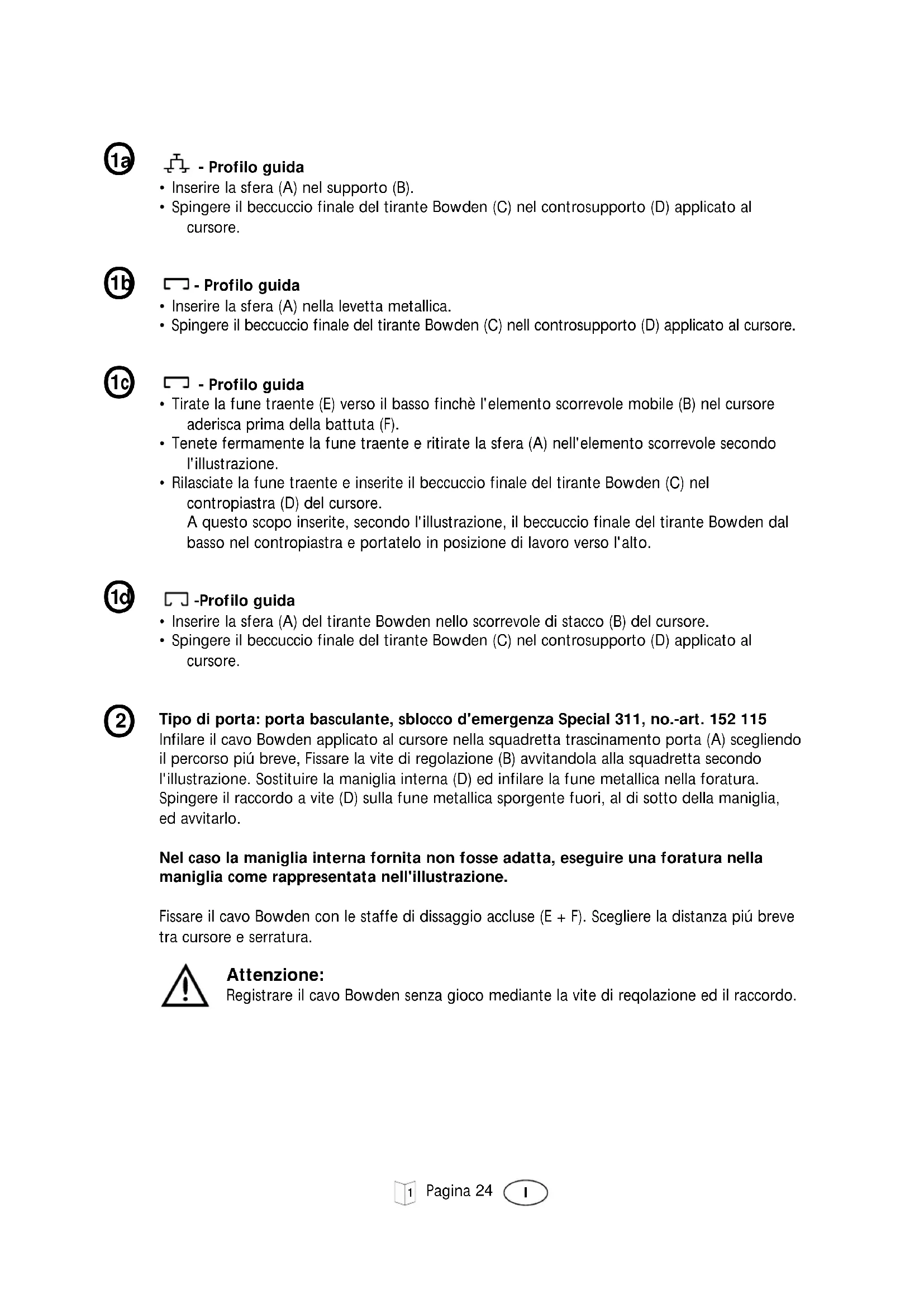 Tipo di porta: basculante non debordante, sblocco d'emergenza Special 301, no.-art. 564 452 Cambiare la maniglia interna della porta e fissare la contropiastra (A) al lato sinistro della cassetta della serratura (B) con una vite autofilettante 4,2x9,5. In alcuni tipi di porta bisogna eseguire ancora la foratura di fissaggio per la contropiastra a una distanza di 60 mm dal centro della maniglia. ø foro 3,5 mm. Eventualmente accorciare il tirante Bowden e fissarlo alla contropiastra mediante la vite di regolazione (C). Togliere il manicotto a vite (D), infilare la fune nel foro della maniglia interna e rimettere il manicotto a vite sulla fune, al di sotto della maniglia interna, e poi avvitarlo solidamente. Fissare il tirante Bowden (E) lungo il manto della porta mediante due occhi di chiusura (F). Evitare attorcigliamenti troppo stretti. Attenzione: Regolare senza gioco il tirante Bowden con la vite di regolazione.Pagina 27