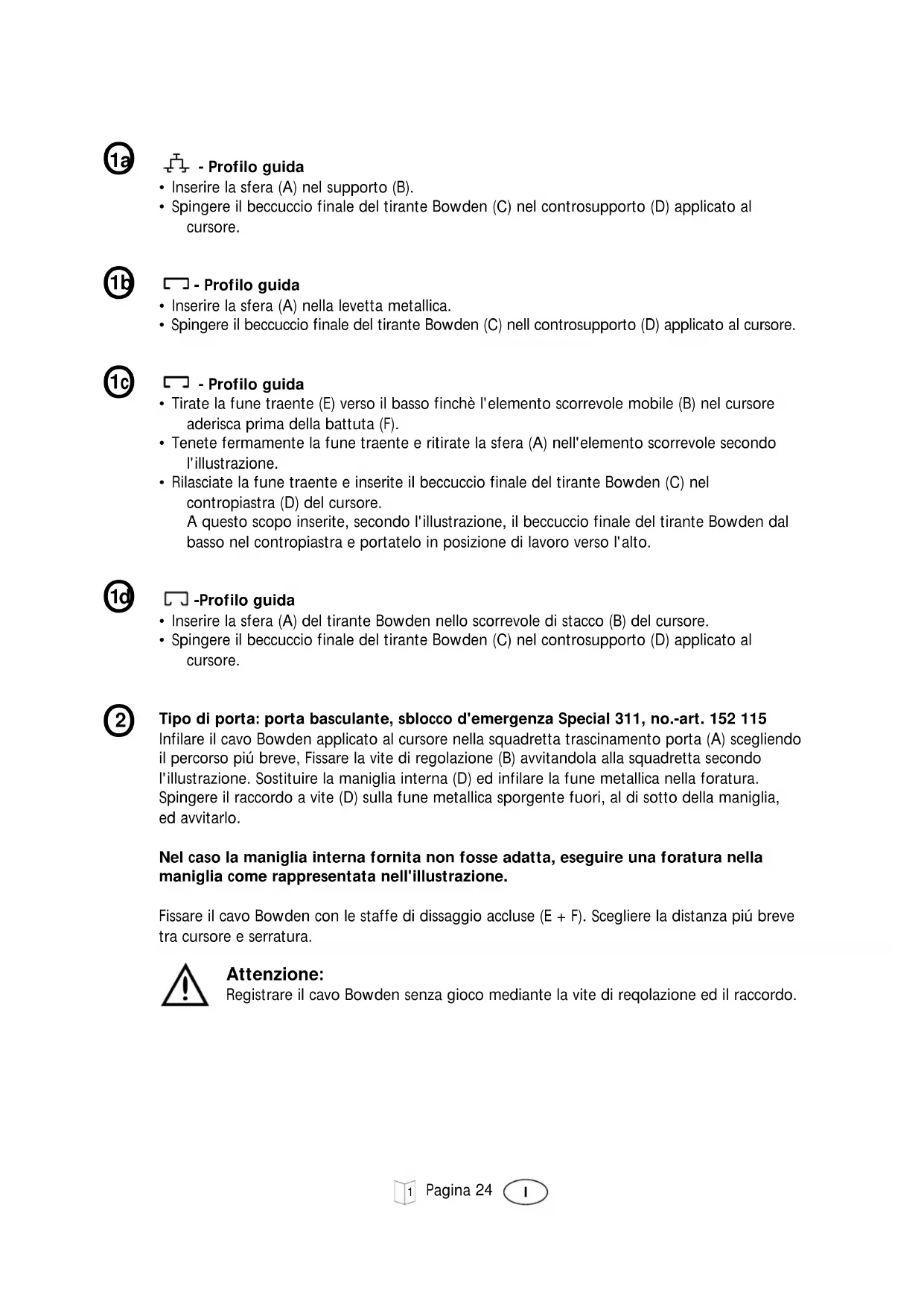 Tipo di porta: porta basculante, sblocco d'emergenza Special 311, no.-art. 152 115 Infilare il cavo Bowden applicato al cursore nella squadretta trascinamento porta (A) scegliendo il percorso piú breve, Fissare la vite di regolazione (B) avvitandola alla squadretta secondo l'illustrazione. Sostituire la maniglia interna (D) ed infilare la fune metallica nella foratura. Spingere il raccordo a vite (D) sulla fune metallica sporgente fuori, al di sotto della maniglia, ed avvitarlo. Nel caso la maniglia interna fornita non fosse adatta, eseguire una foratura nella maniglia come rappresentata nell'illustrazione. Fissare il cavo Bowden con le staffe di dissaggio accluse (E + F). Scegliere la distanza piú breve tra cursore e serratura. Attenzione: Registrare il cavo Bowden senza gioco mediante la vite di reqolazione ed il raccordo. - Profilo guida