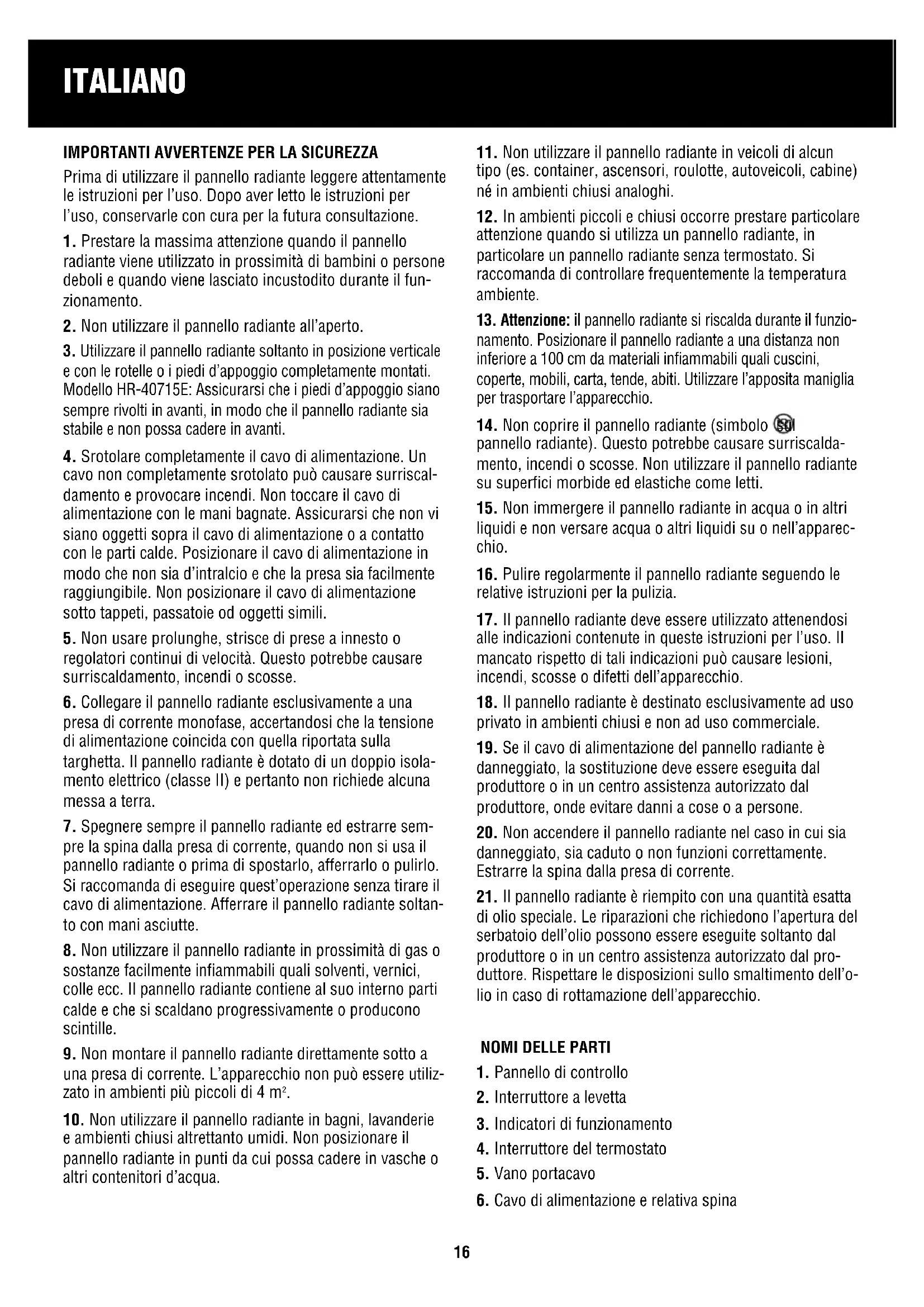 15. Non immergere il pannello radiante in acqua o in altri