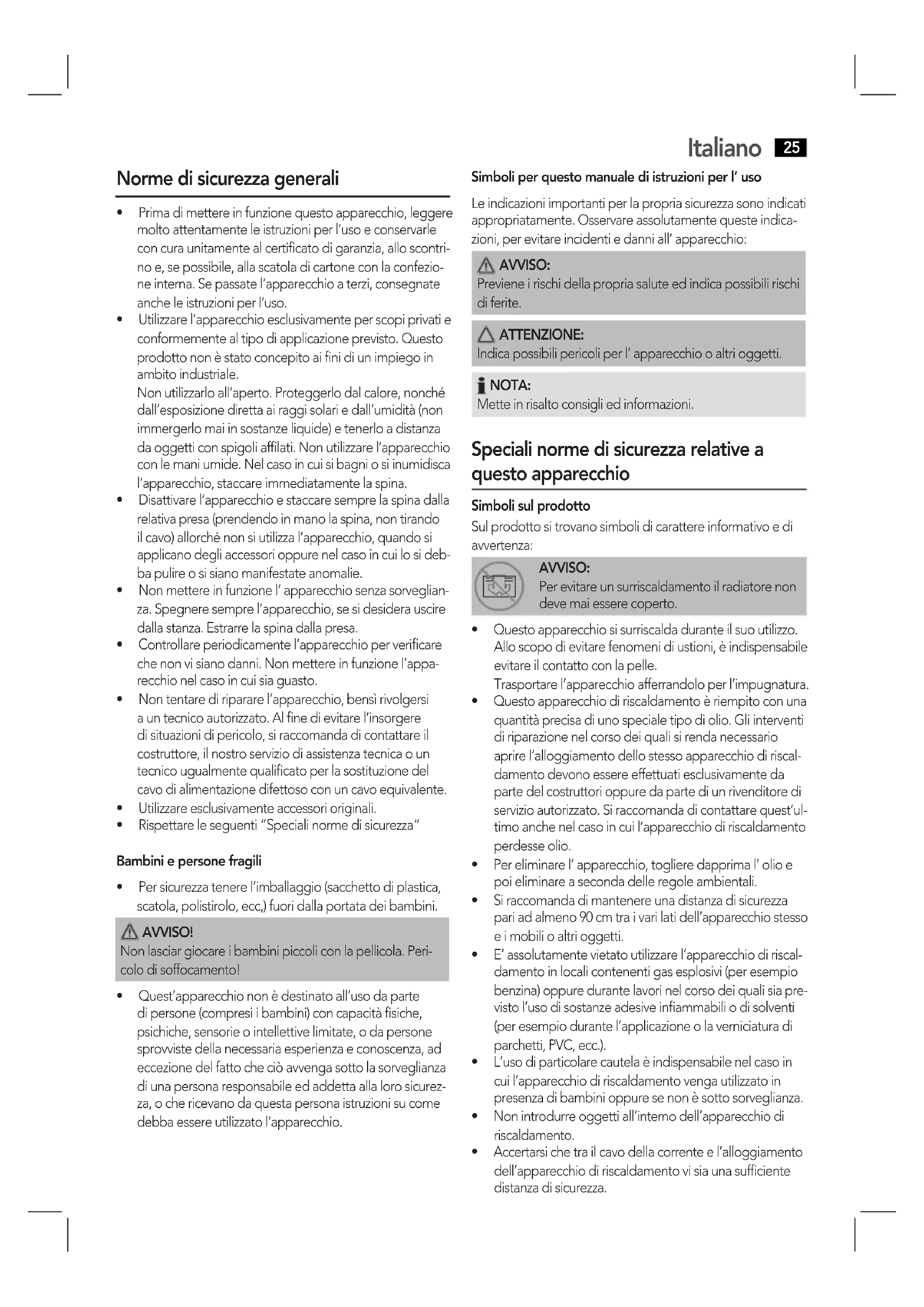 - Quest’apparecchiononèdestinatoall’usodaparte di persone (compresi i bambini) con capacità fisiche, psichiche, sensorie o intellettive limitate, o da persone sprovviste della necessaria esperienza e conoscenza, ad eccezione del fatto che ciò avvenga sotto la sorveglianza di una persona responsabile ed addetta alla loro sicurez- za, o che ricevano da questa persona istruzioni su come debba essere utilizzato l’apparecchio. Simboli per questo manuale di istruzioni per l’ uso Le indicazioni importanti per la propria sicurezza sono indicati appropriatamente. Osservare assolutamente queste indica- zioni,perevitareincidentiedanniall’apparecchio: AVVISO: Previene i rischi della propria salute ed indica possibili rischi di ferite. ATTENZIONE: Indica possibili pericoli per l’ apparecchio o altri oggetti. NOTA: Mette in risalto consigli ed informazioni. Speciali norme di sicurezza relative a questo apparecchio Simboli sul prodotto Sul prodotto si trovano simboli di carattere informativo e di avvertenza: AVVISO: Per evitare un surriscaldamento il radiatore non deve mai essere coperto.