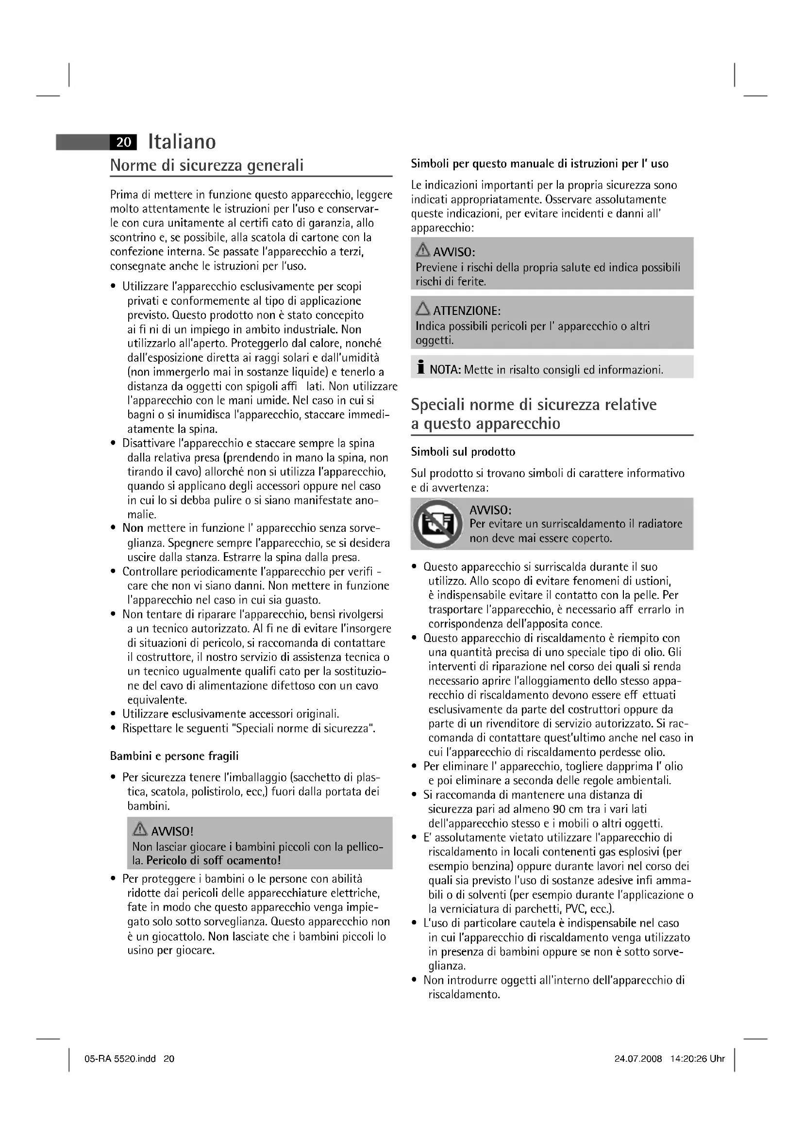 - Nel caso in cui non si utilizzi l’apparecchio per un periodo di tempo prolungato, lo si può conservare nell’imballaggio originale. Dati tecnici Modello: ......................................RA 5520 / RA 5521 / RA 5522 Alimentazione rete: .................................................230 V, 50 Hz Consumo di energia:...................1500 W / 2000 W / 2200 W Classe di protezione: ........................................................................Ι Peso netto: ..................................9,00 kg / 11,30 kg / 12,90 kg Questo apparecchio è stato controllato sulla base di tutte le direttive CE attuali in vigore in questo settore, quali per esempio la normativa in materia di compati- bilità elettromagnetica e la direttiva in materia di bassa tensione, ed è stato costruito conformemente alle norme di sicurezza più moderne. Con riserva di apportare modi che tecniche. Signi cato del simbolo „Eliminazione“ Salvaguardare l’ ambiente, gli elettrodomestici non vanno eliminati come ri uti domestici. Per l’ eliminazione degli elettrodomestici, fare uso dei posti di raccolta previsti per questo tipo e porre quegli elettrodomestici che non sono più in uso. Si contribuisce così ad evitare un e etto potenziale sull’ ambiente e sulla salute, dovuto magari ad una eliminazi- one sbagliata. Questo signi ca un contributo personale alla riutiliz- zazione, al riciclaggio e altre forme di utilizzazione di elettrodomestici ed apparecchi elettronici usati. Si possono trovare le corrispondenti informazioni sugli appositi luoghi di raccolta, nelle amministrazioni dei comuni. 05-RA 5520.indd 2205-RA 5520.indd 22 24.07.2008 14:20:27 Uhr24.07.2008 14:20:27 UhrNorsk